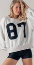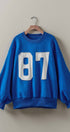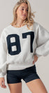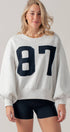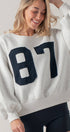 Design: A classic crewneck sweatshirt in a heathered knit, featuring a large '87' varsity-style number appliqué on the chest.