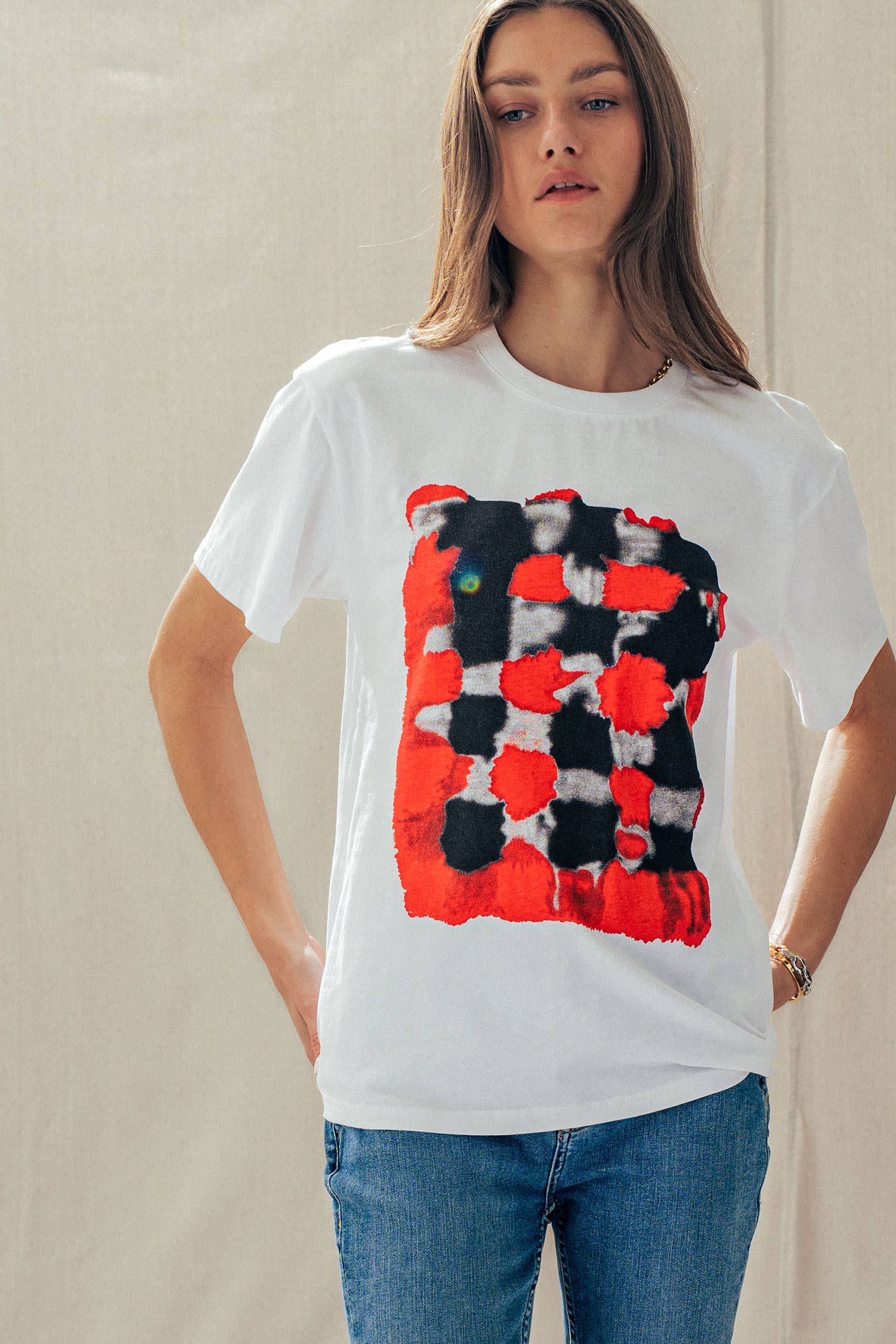 Design: White t-shirt with abstract red, black, and grey geometric paint print