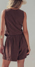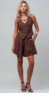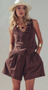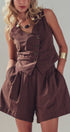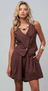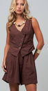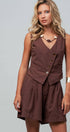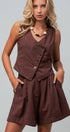 Design: A chocolate brown matching set featuring a vest with a diagonal button placket and matching pleated shorts.