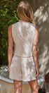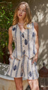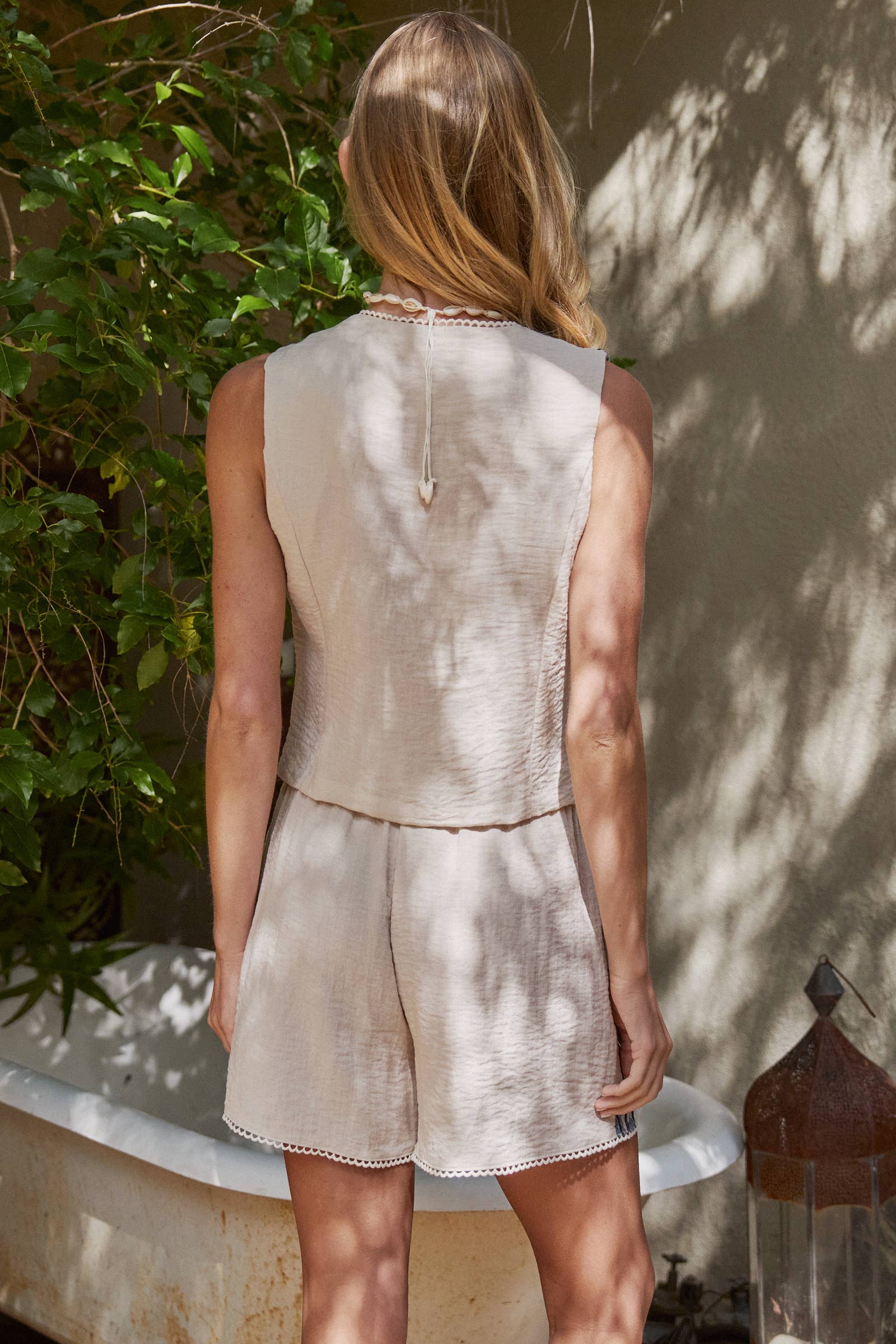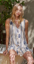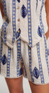 Complete the ultimate festival-ready look with these matching embroidered shorts. Crafted from the same airy linen blend as the vest, these shorts feature vertical rows of intricate blue geometric embroidery. Designed with a comfortable elastic waistband and finished with a delicate crochet hem, they are the perfect blend of style and ease.