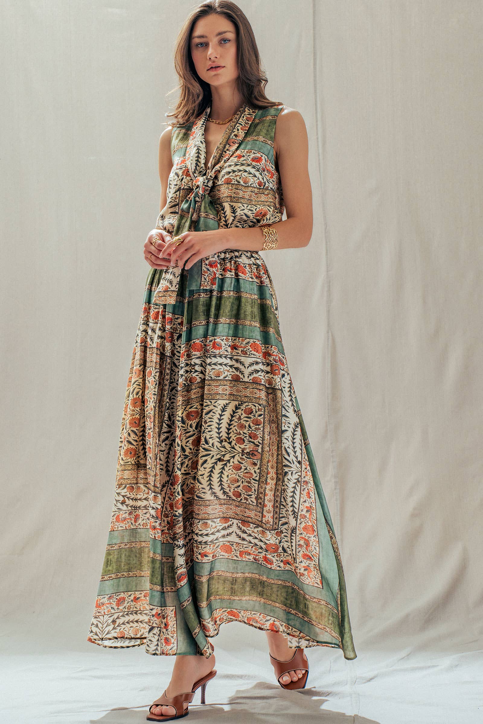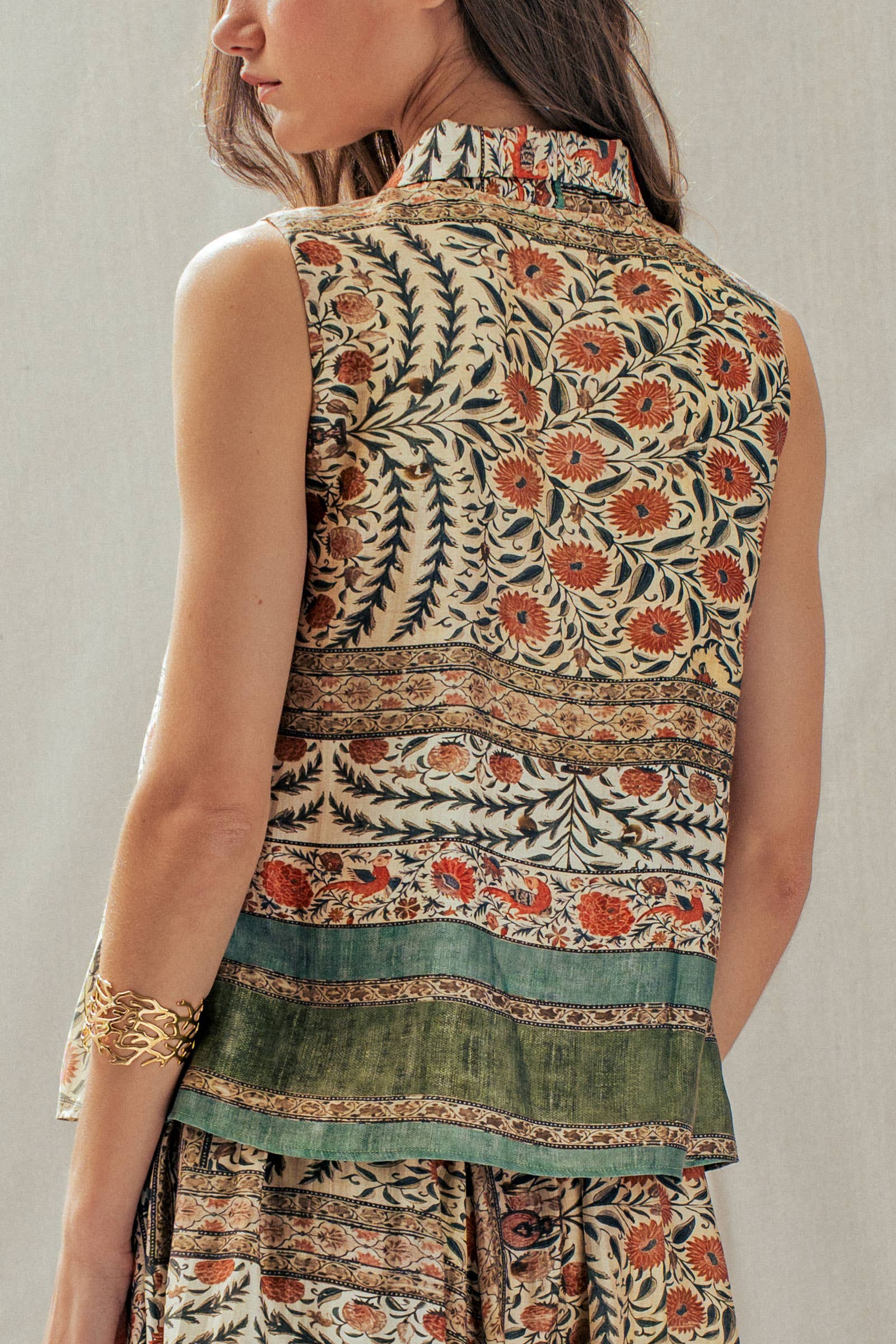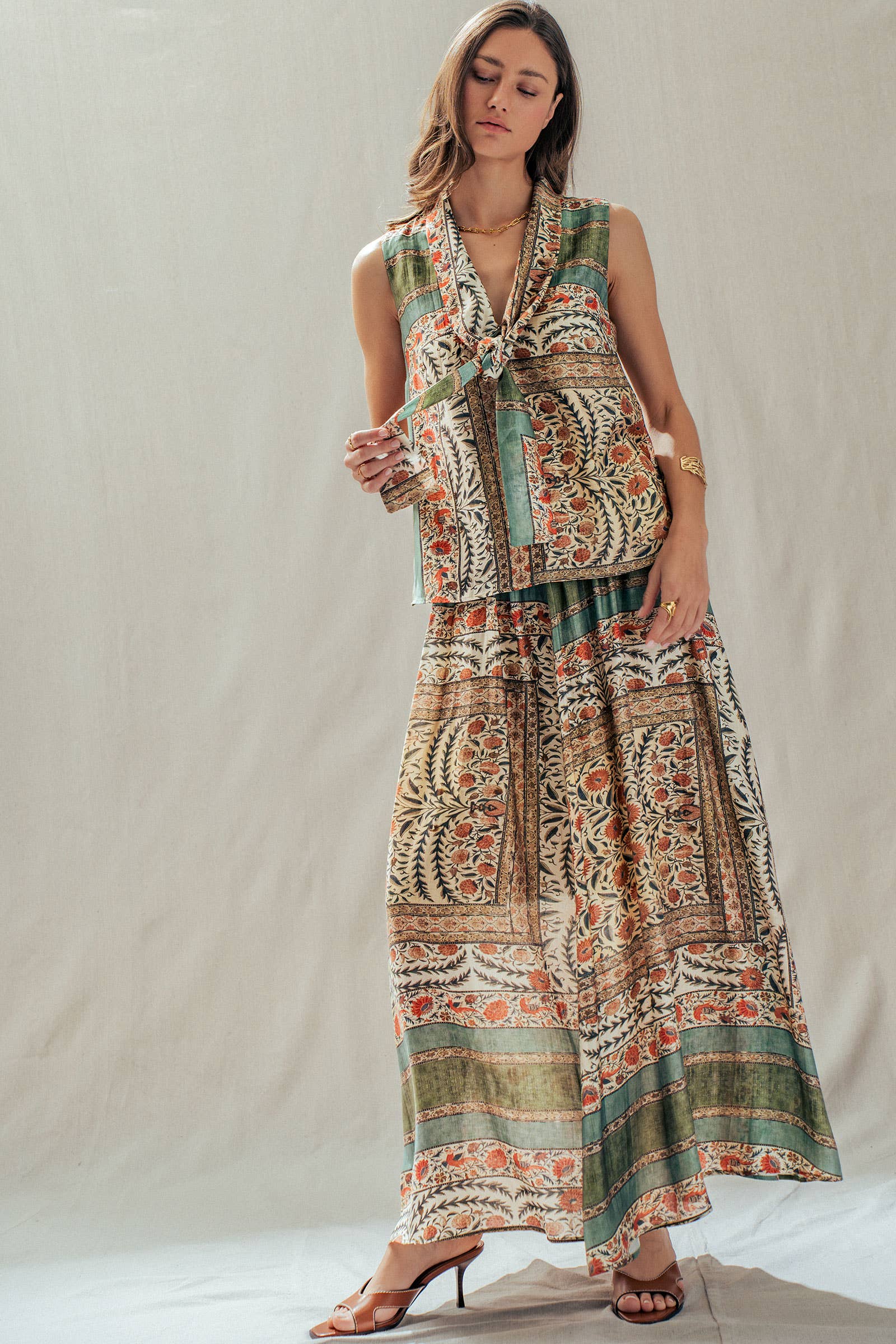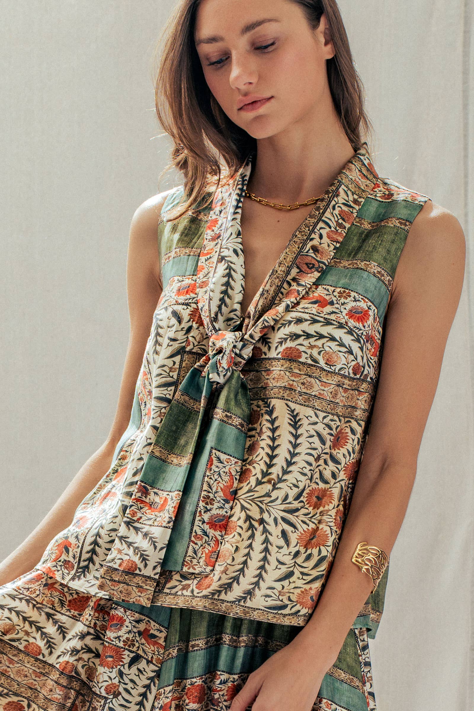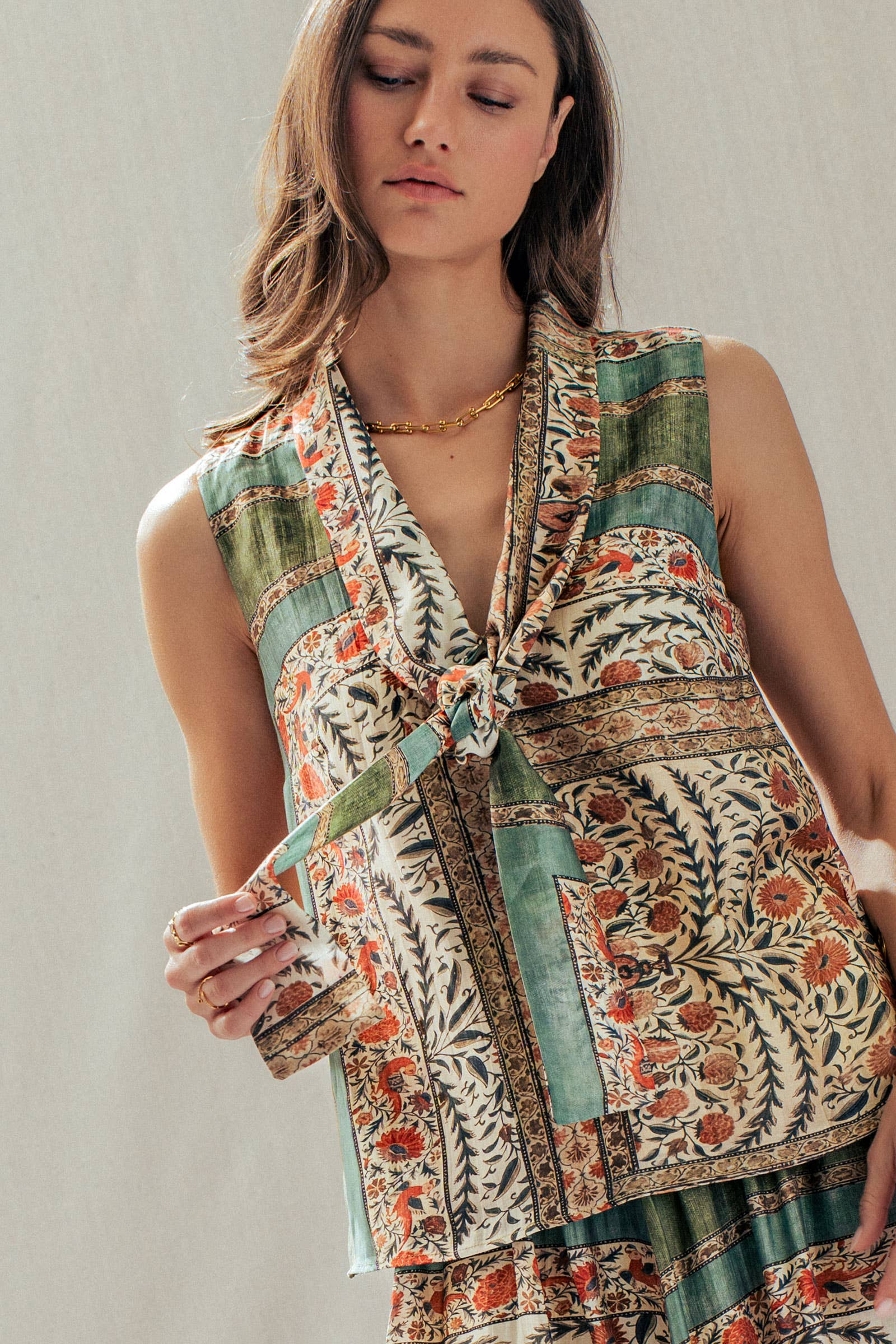 Infuse your wardrobe with bohemian artistry with this vintage-inspired sleeveless top. Crafted from a premium Tencel blend for a silky, fluid drape, this blouse features an intricate botanical and bird block print in rich earth tones. The statement tie-front neckline adds a sophisticated 70s touch, perfect for pairing with the matching skirt or high-waisted denim.