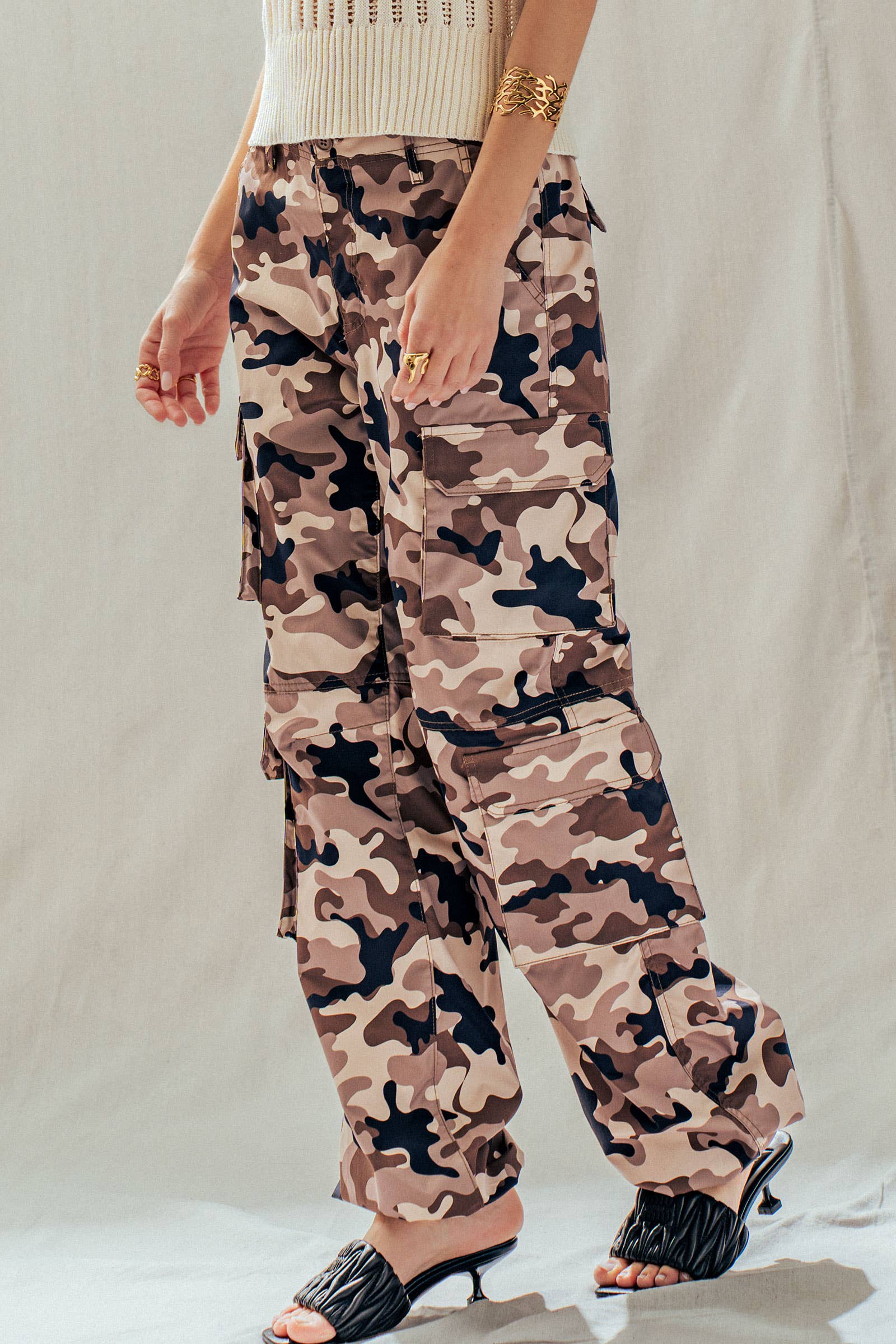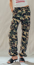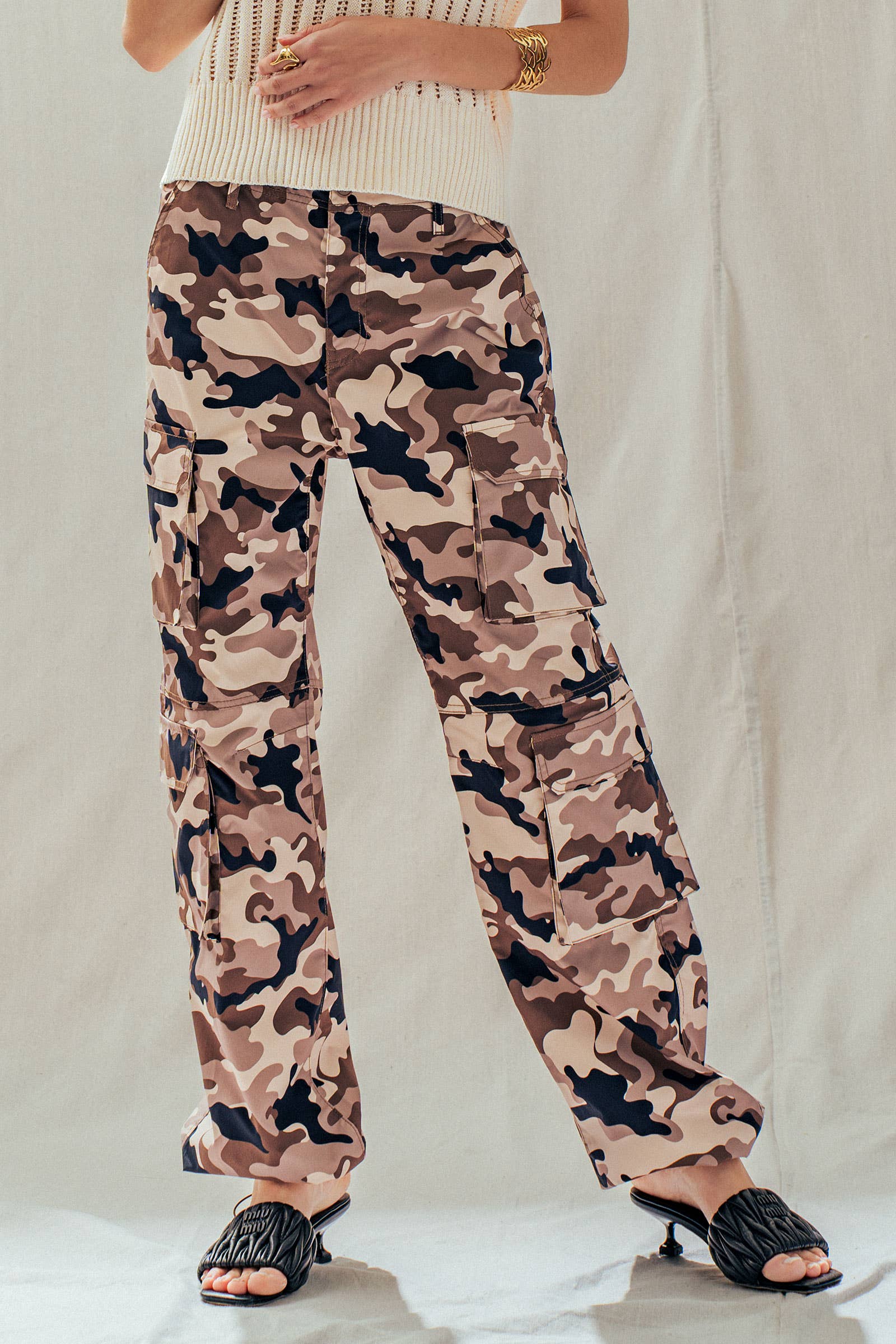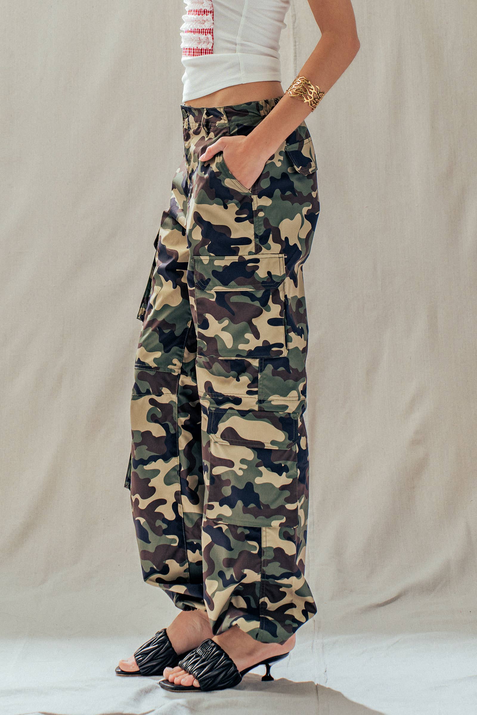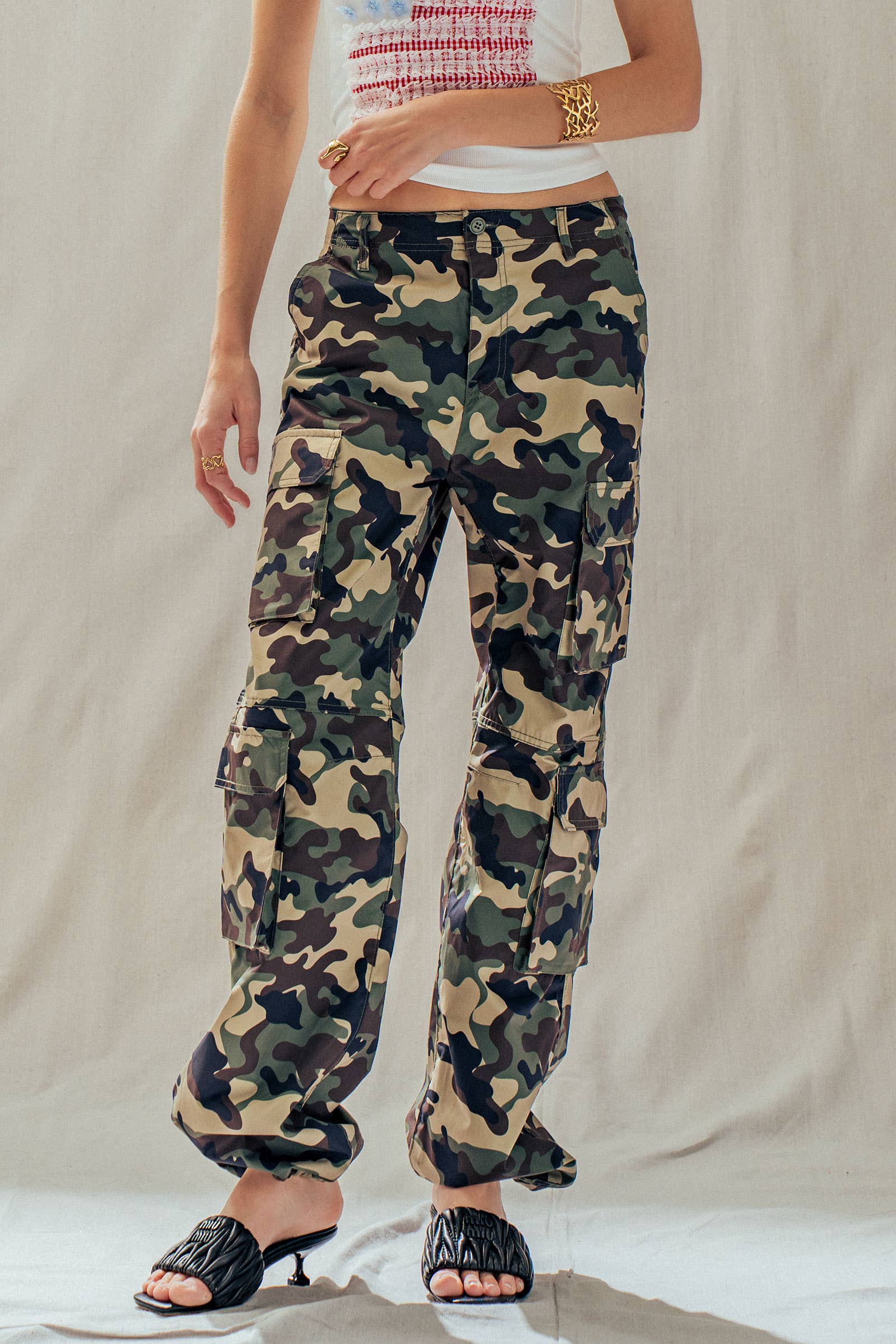 Design: High-waisted utility pants featuring a classic camouflage print in both Green and Desert Tan colorways.