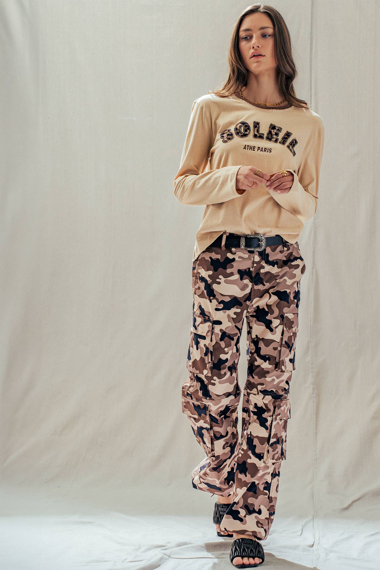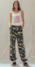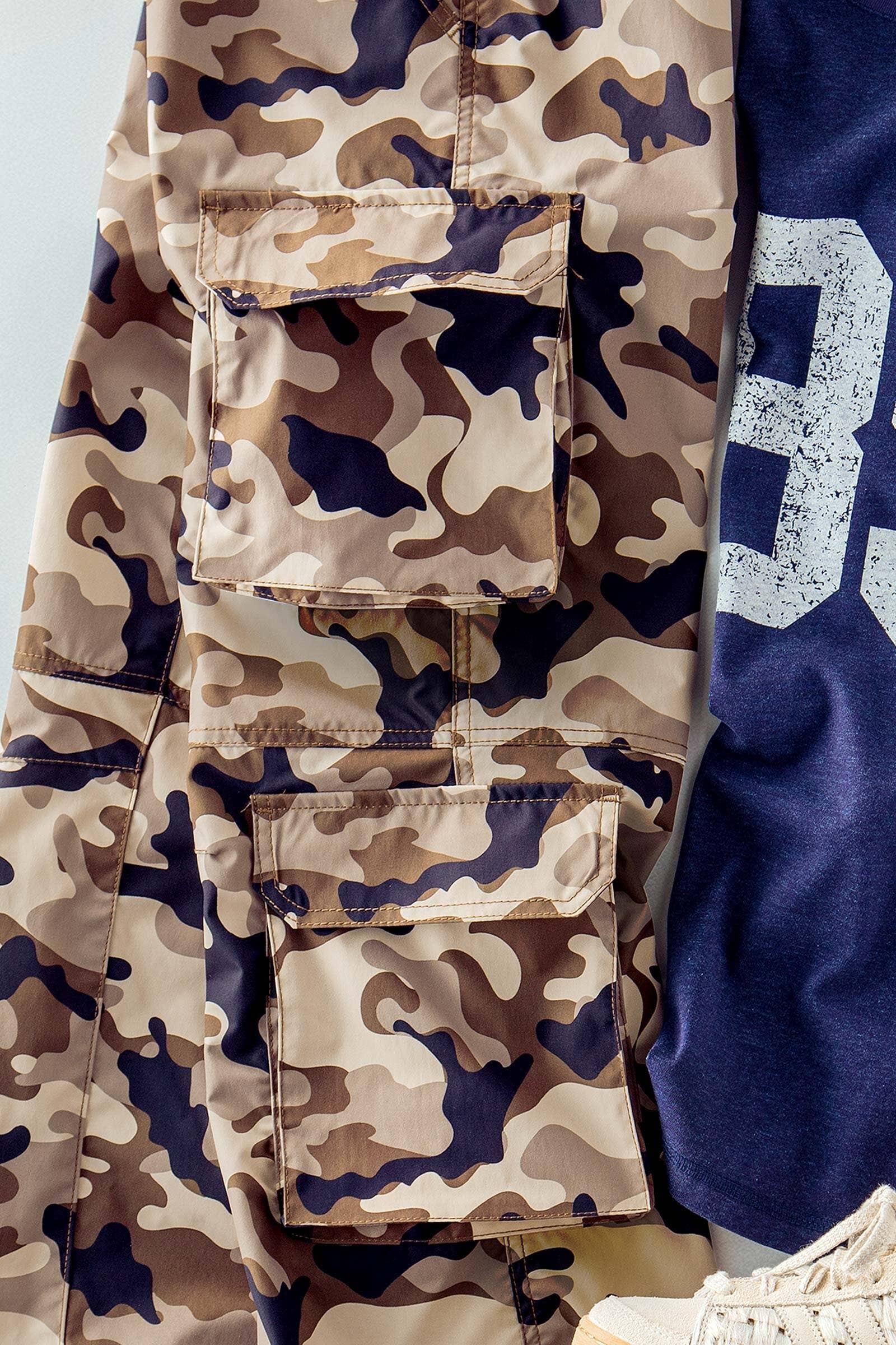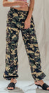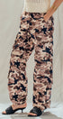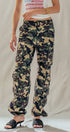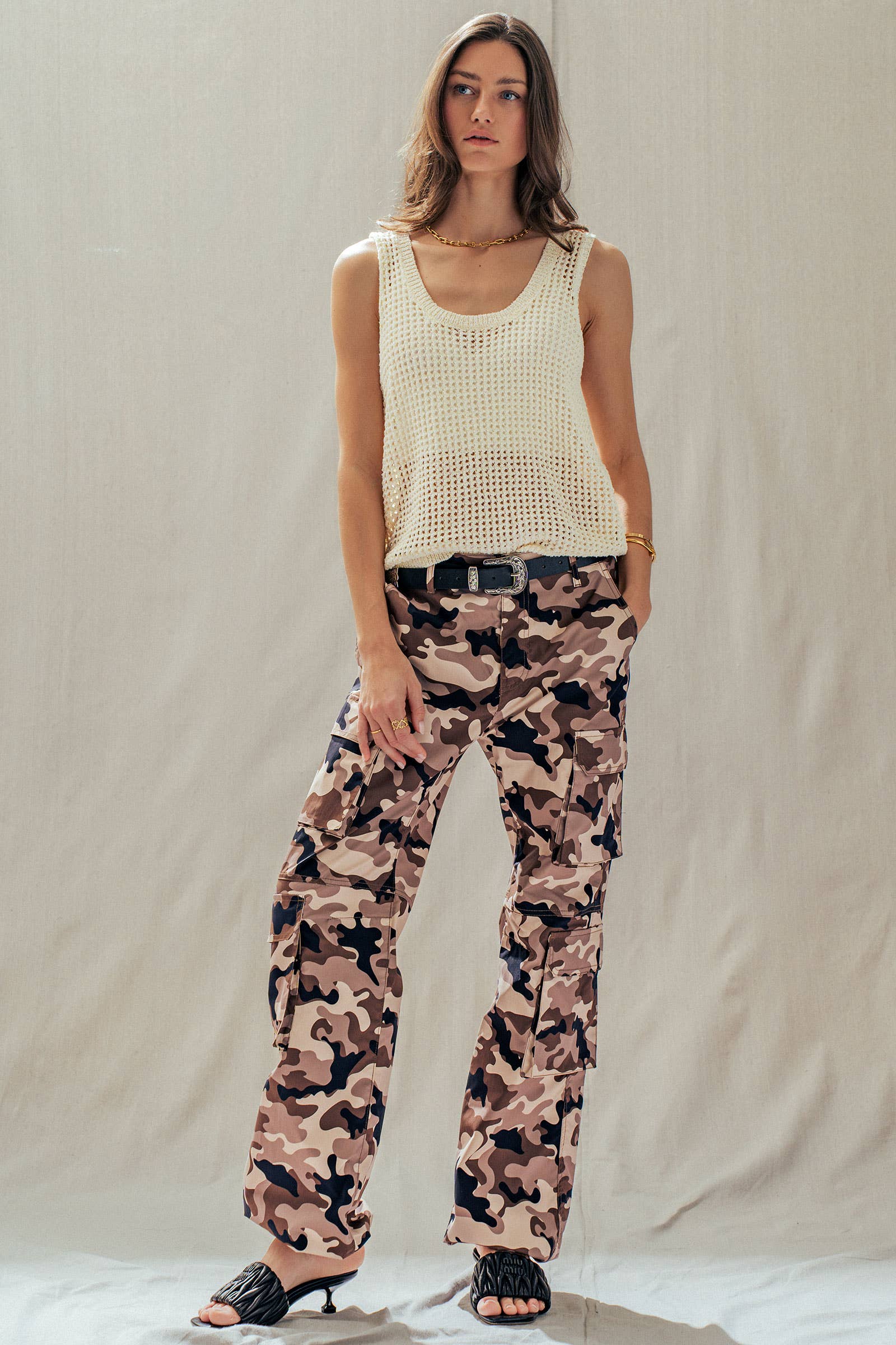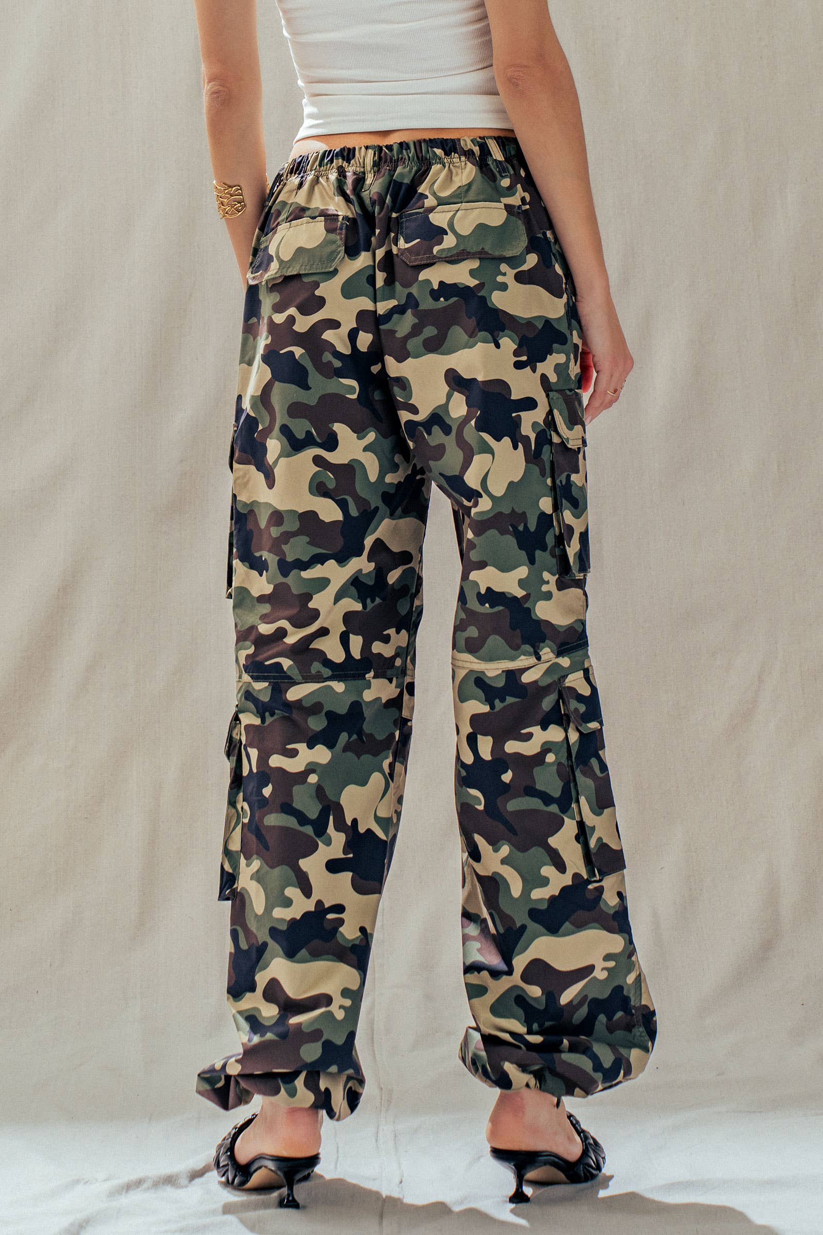 Design: High-waisted utility pants featuring a classic camouflage print in both Green and Desert Tan colorways.