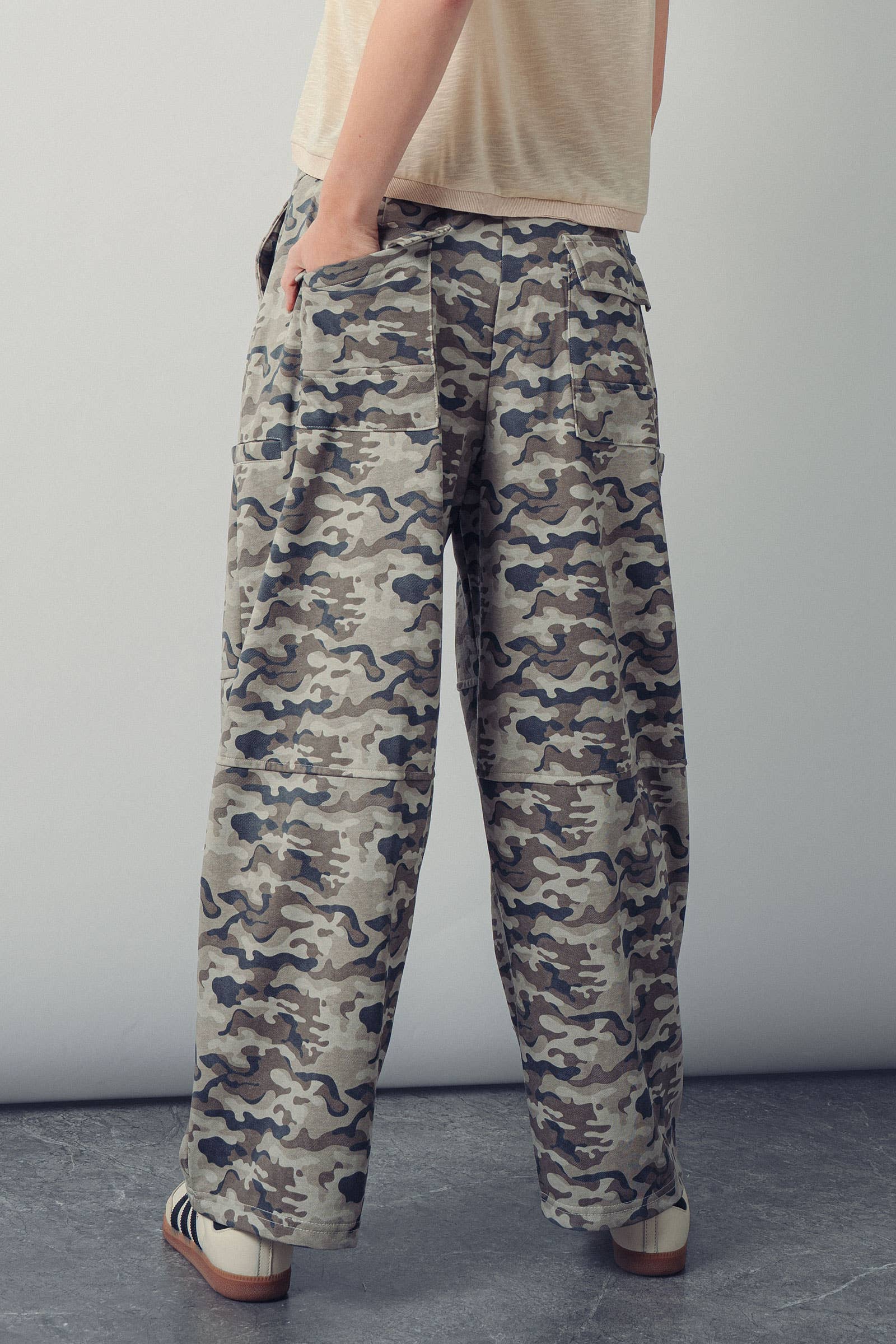 Get a cool, relaxed look with these camo sweatpants. They have a wide-leg fit and a drawstring waist for comfort. The cargo pocket details add a utility vibe, making them perfect for lounging or a casual streetwear look.