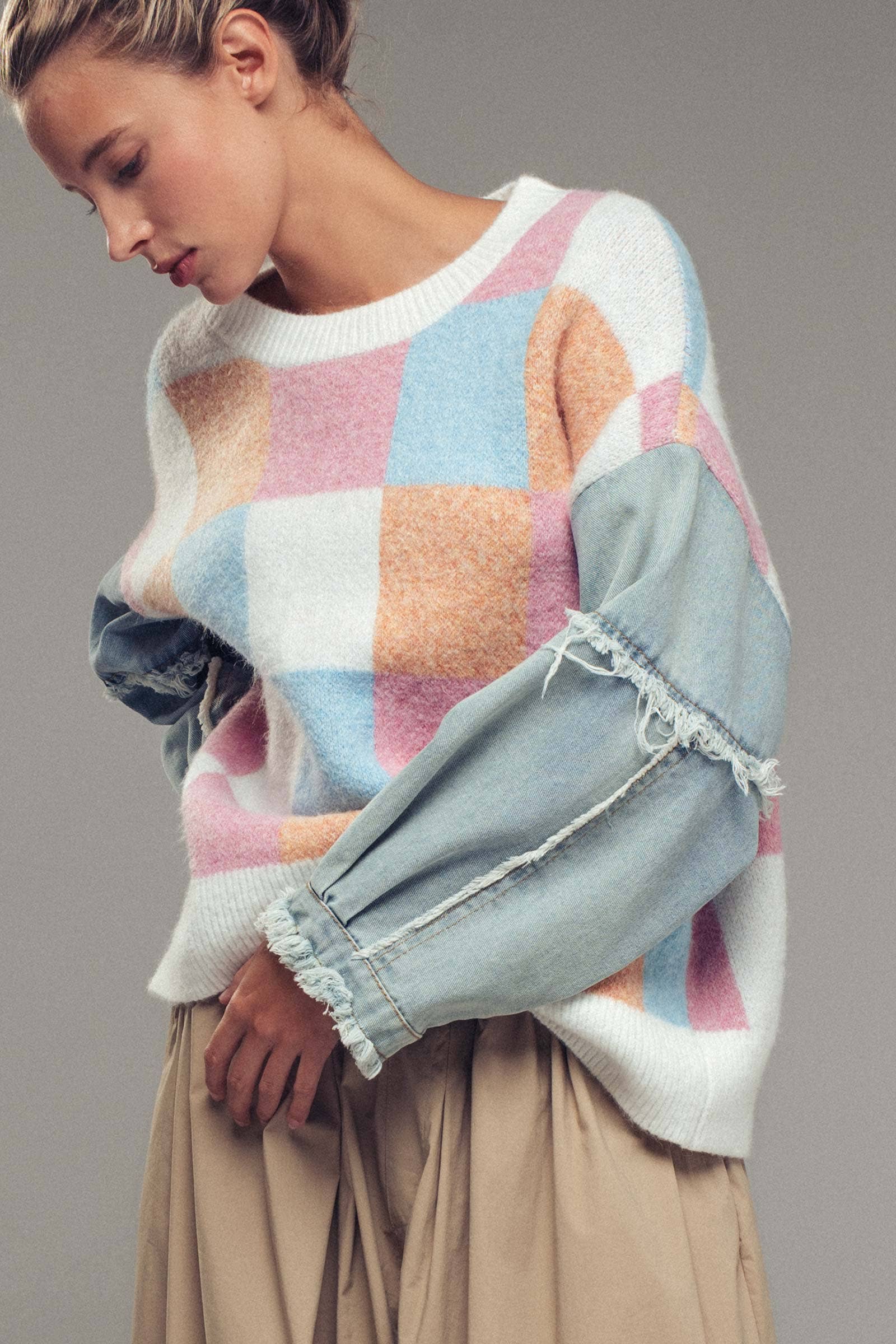 This playful sweater features a checkered knit body with stylish denim sleeves with a ribbed trim. The colorful design and unique details create a cozy piece, perfect for everyday wear.