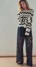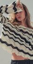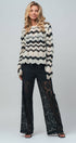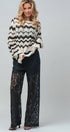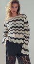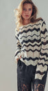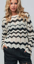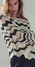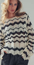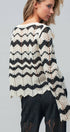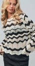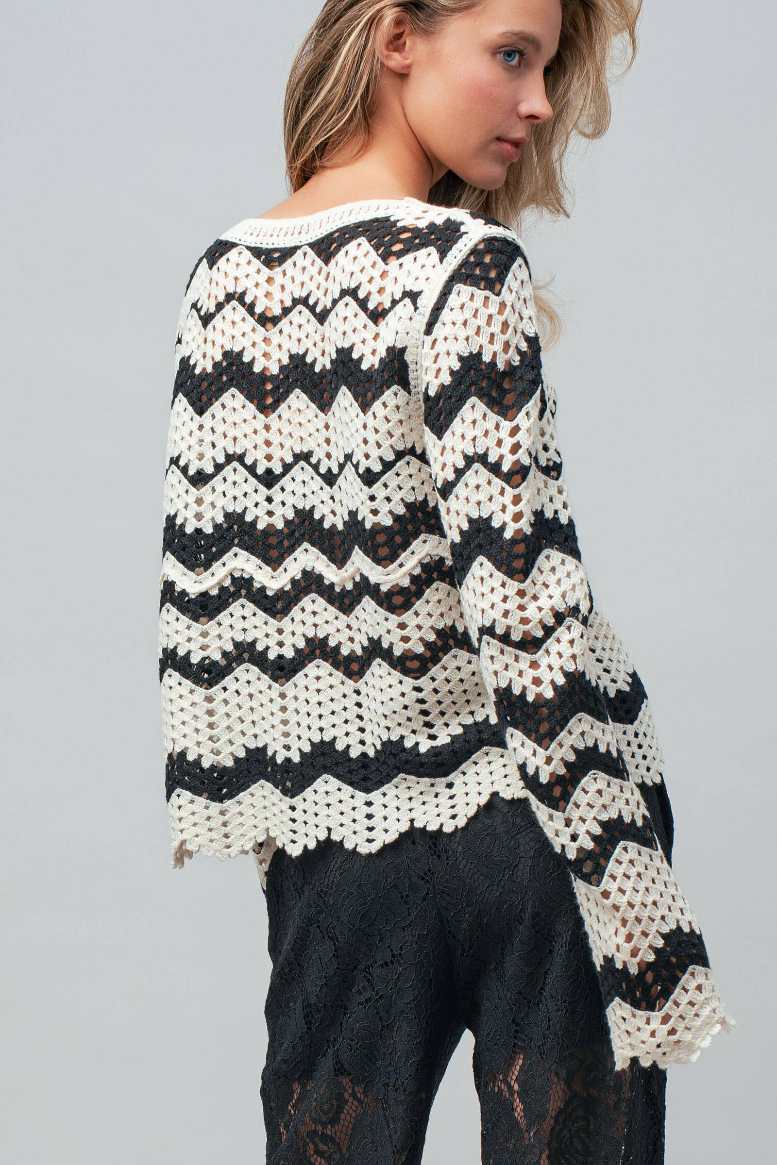 Embrace bohemian vibes with this eye-catching crochet sweater. Featuring a bold black and cream chevron pattern and an airy open-knit texture, this pullover is perfect for layering over a camisole to add dimension and artistic flair to your look.