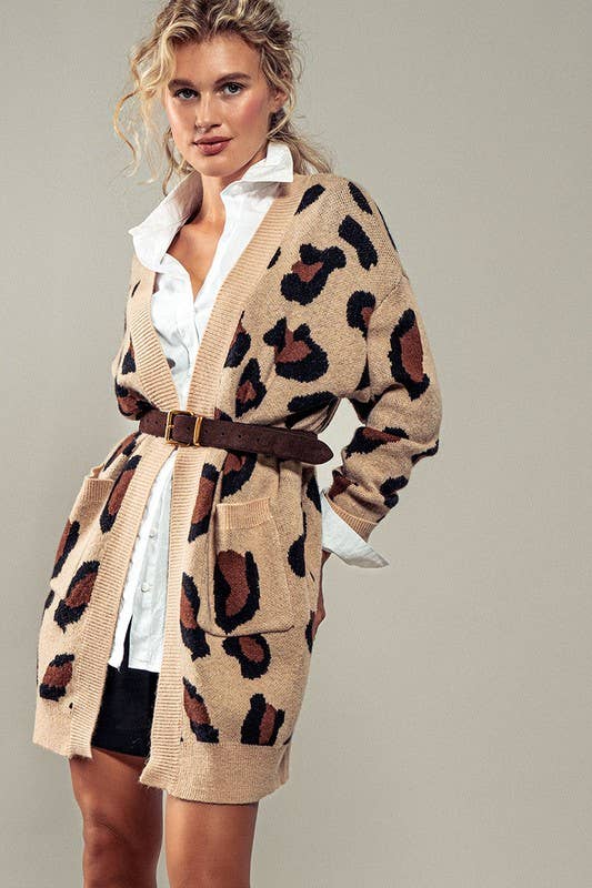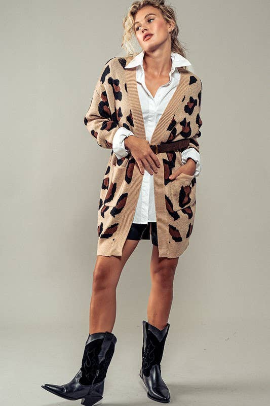 Make a statement with this oversized knit cardigan featuring a bold animal print and two front pockets. Its open-front design and relaxed fit offer effortless layering for casual or western-inspired looks. Perfect for adding a touch of boho flair to any outfit.