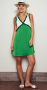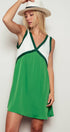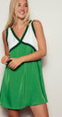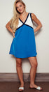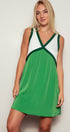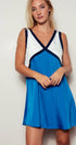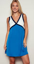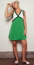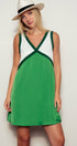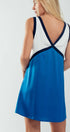 This sophisticated A-line midi dress features a contrasting ivory bodice and bold skirt, creating a striking colorblock design. The deep V-neckline on both front and back enhances its elegance, while the premium poly-spandex fabric ensures a flattering fit with excellent movement. Ideal for spring and summer occasions.