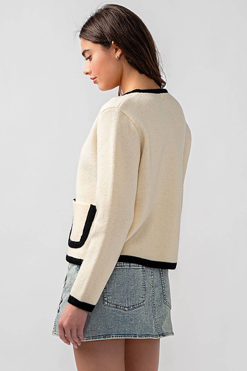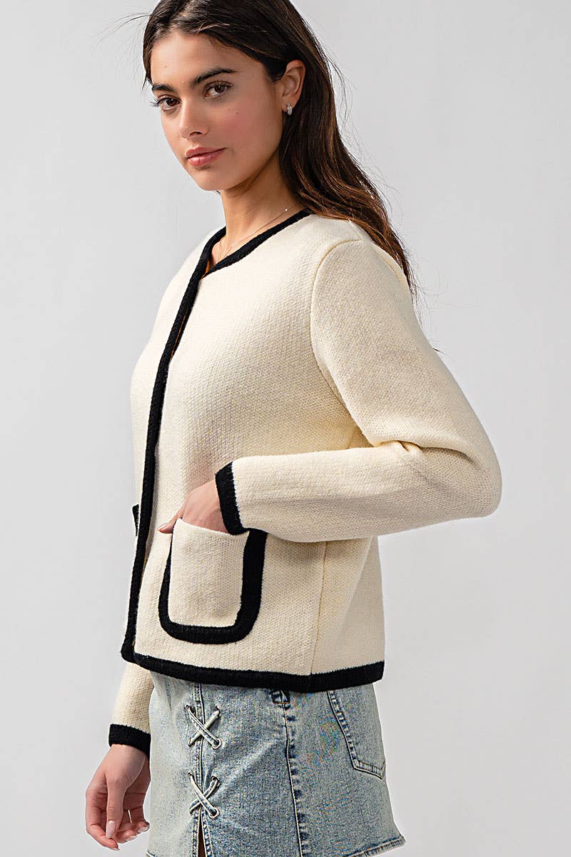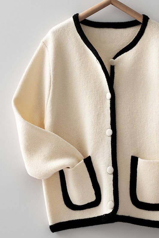 Elevate your wardrobe with this chic button-up cardigan featuring bold contrast trim and functional patch pockets. Its timeless design pairs seamlessly with modern styling, making it a versatile choice for any occasion.