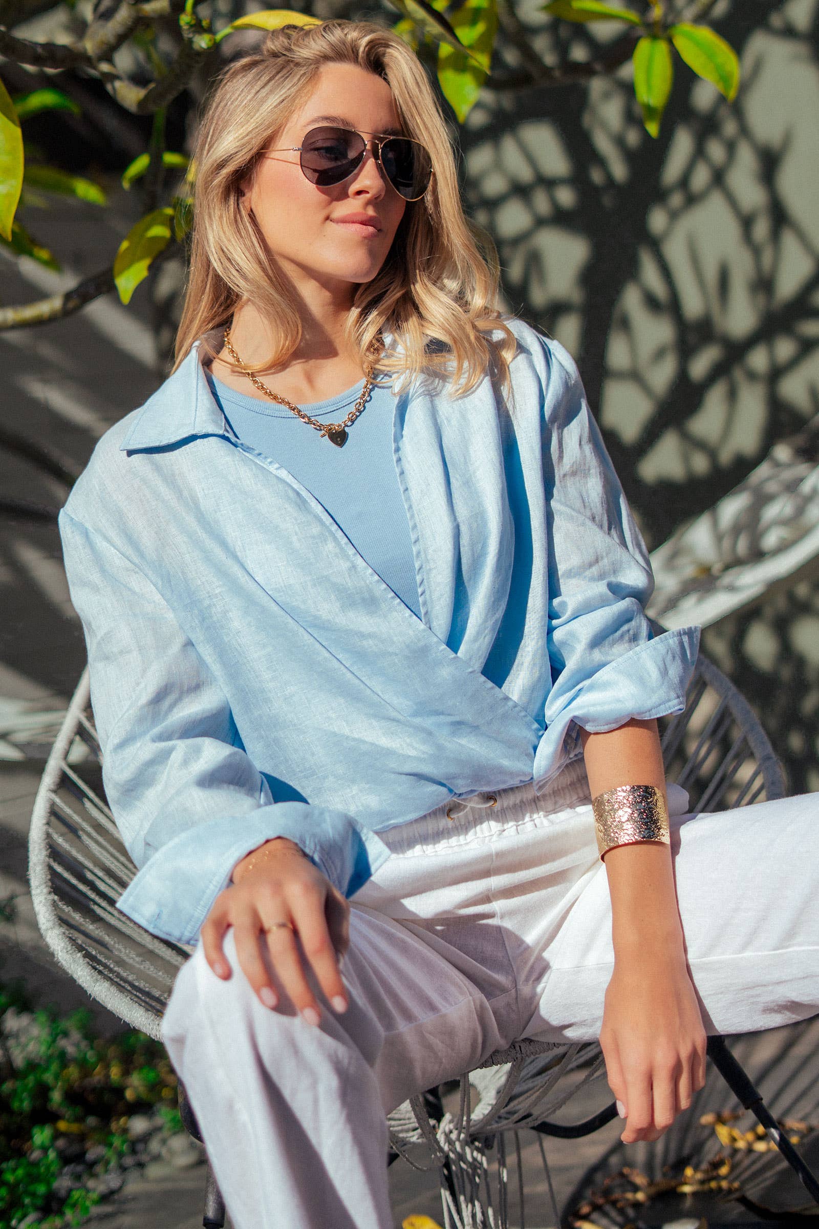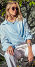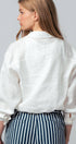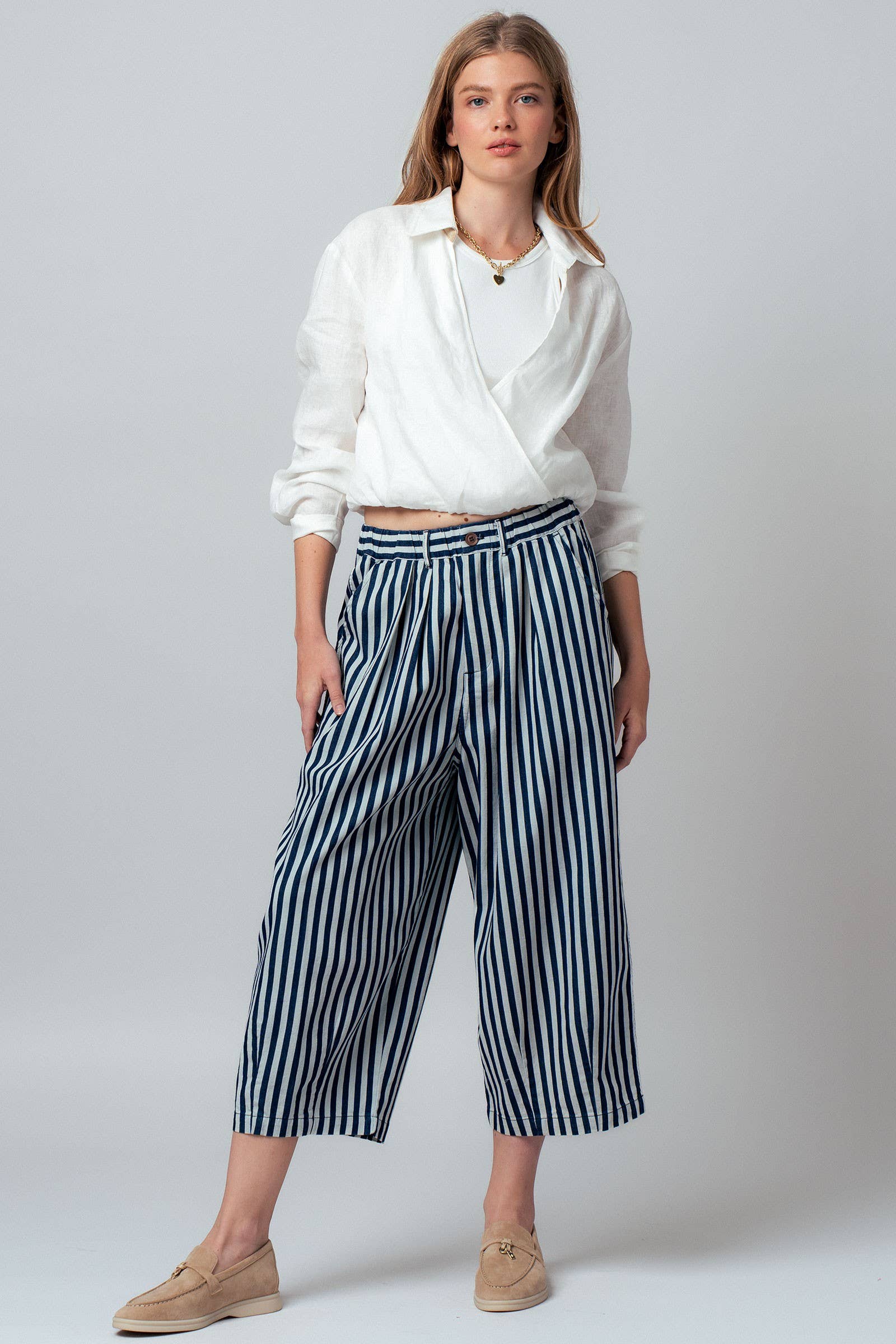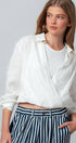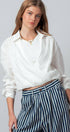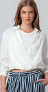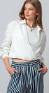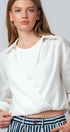 Refresh your warm-weather rotation with this crisp white top, crafted from breathable 100% linen for a sophisticated, airy feel. The design features a classic shirt collar that transitions into a plunging surplice wrap front, anchored by a comfortable elasticized hem that creates a trendy cropped silhouette. Ideally suited for layering, it includes a soft contrast knit inner panel at the neckline for added coverage and comfort.