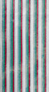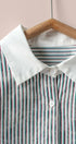 Design: Vertical multi-colored stripes with contrast white collar and cuffs