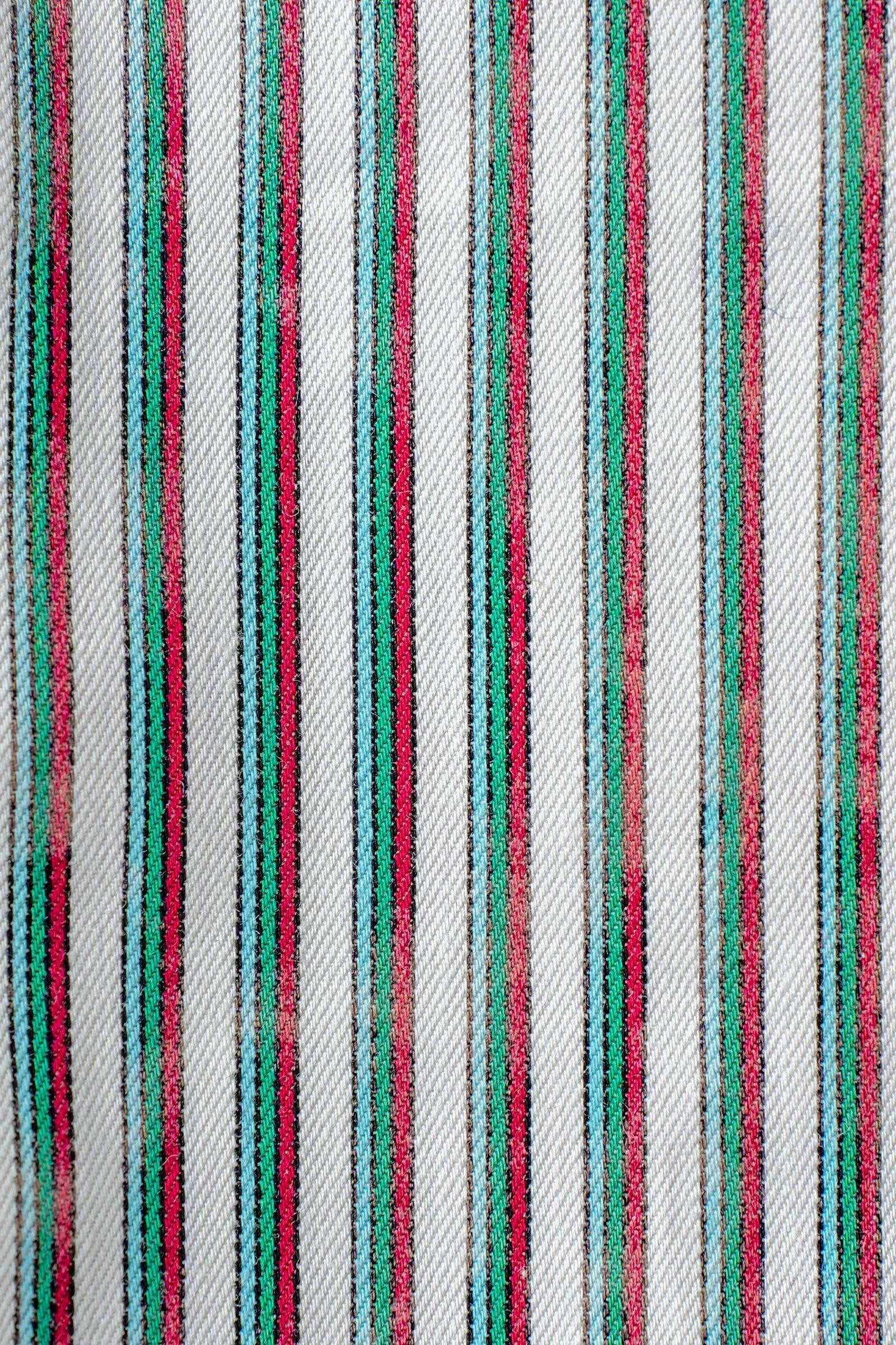 This crisp 100% cotton shirt features a vintage-inspired vertical stripe pattern in green, red, and blue tones, accented by a sharp white contrast collar and cuffs. Its tailored yet relaxed fit makes it a versatile piece that pairs effortlessly with jeans for a polished, everyday look that nods to classic western apparel aesthetics.
