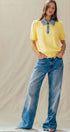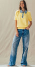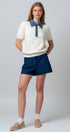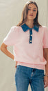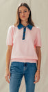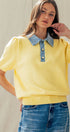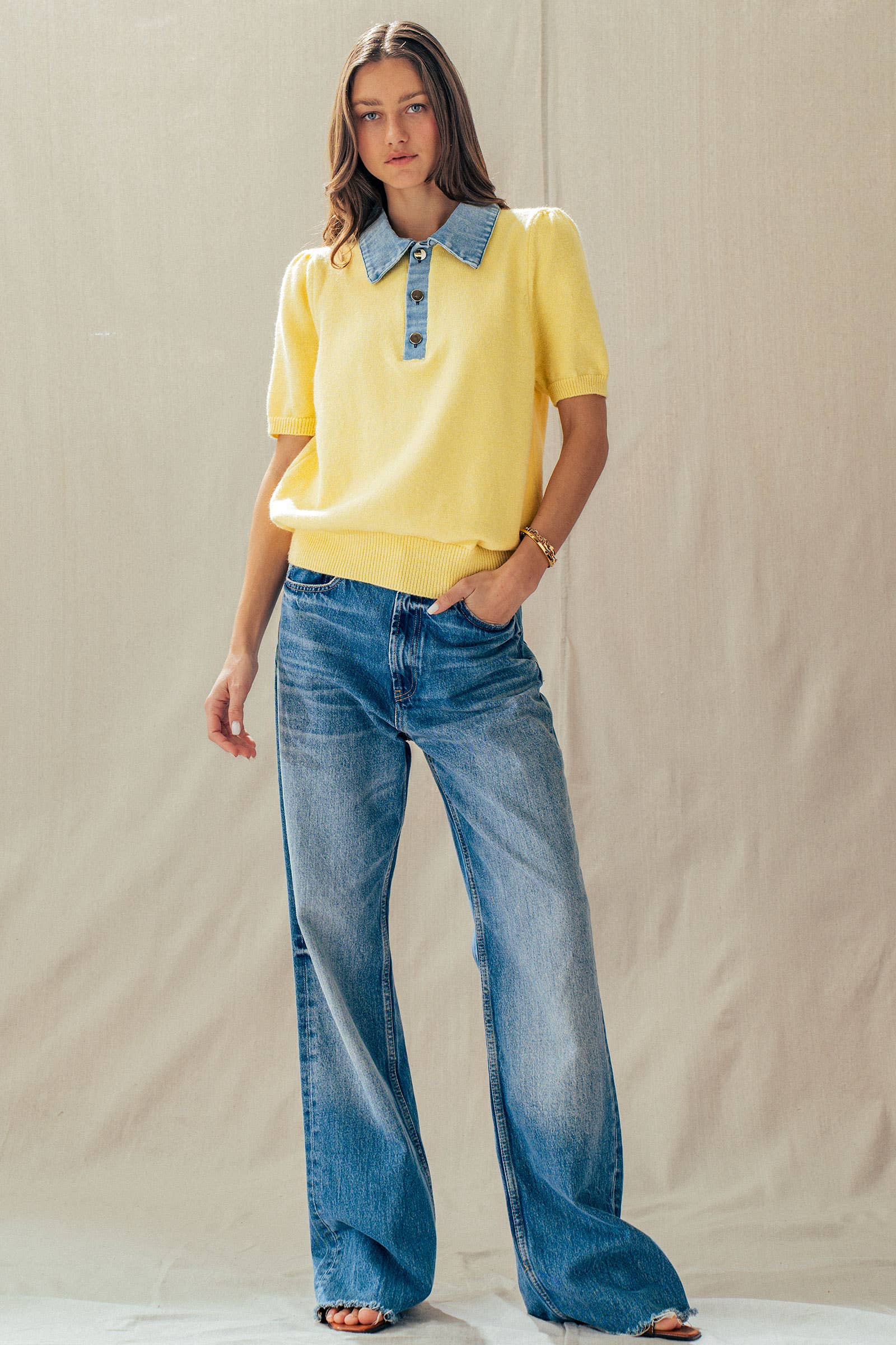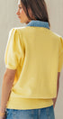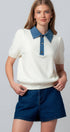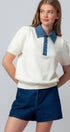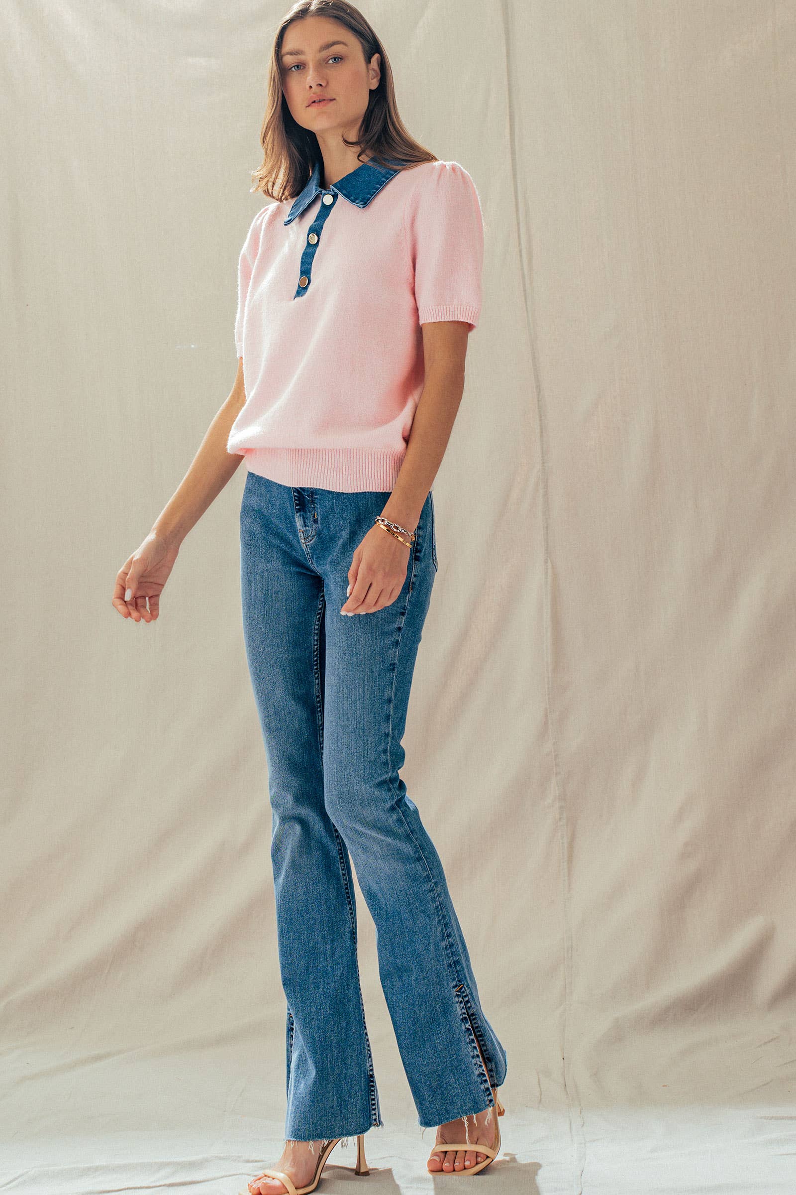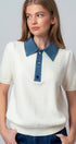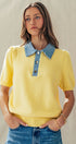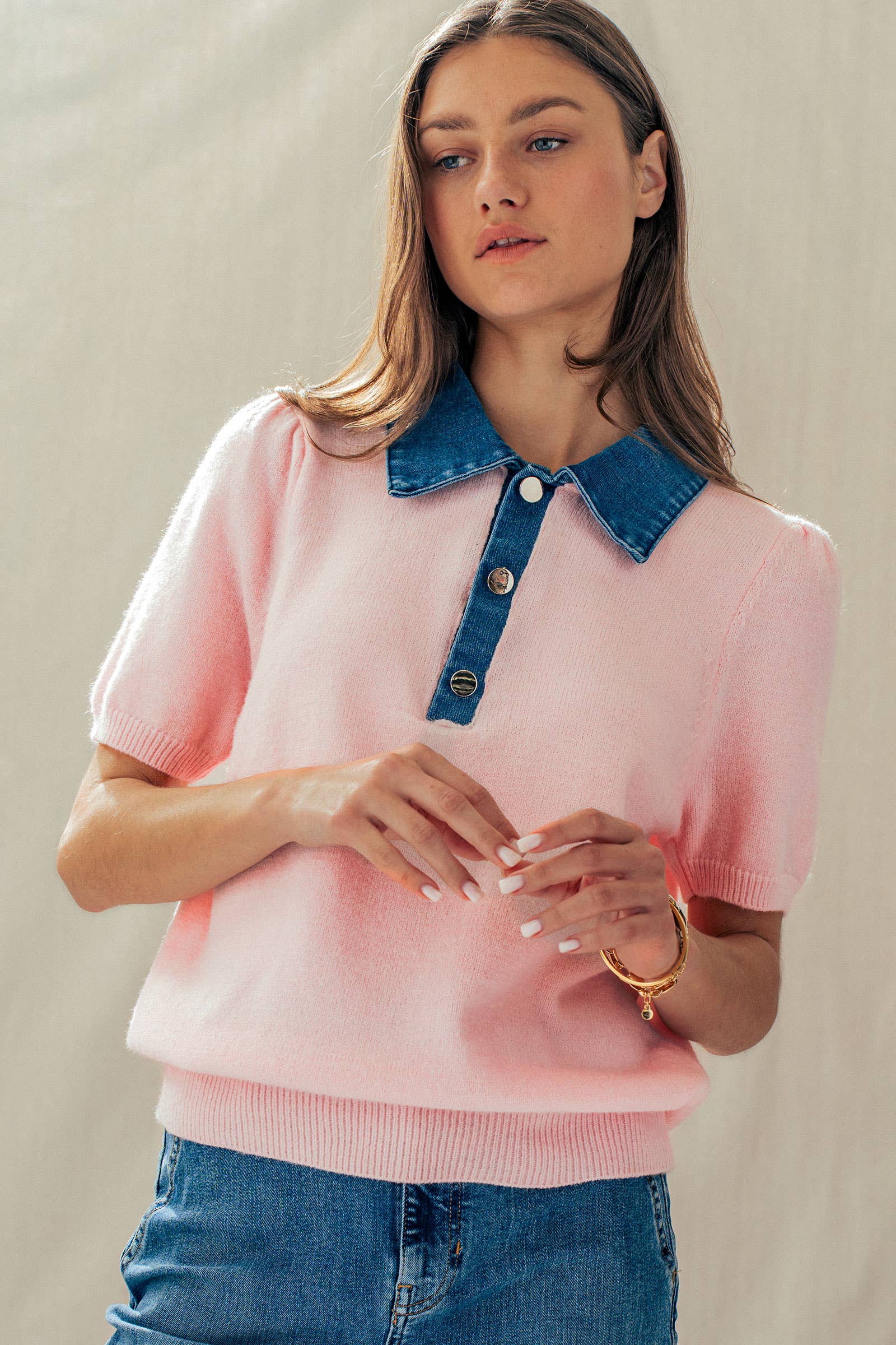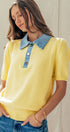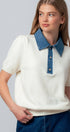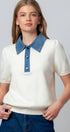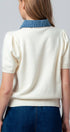 Achieve a chic, updated preppy look with this short-sleeve knit sweater. The classic knit body is sharply contrasted by a dark wash denim collar and button placket. The soft knit and tailored fit make it a stylish and versatile top.