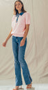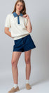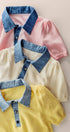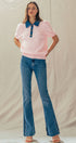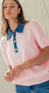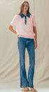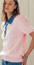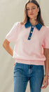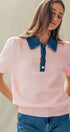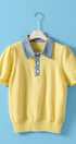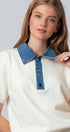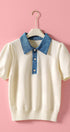 Design: Features a knit body with a contrast denim collar and button half-placket.