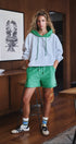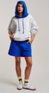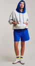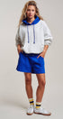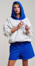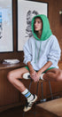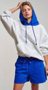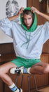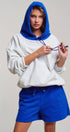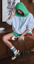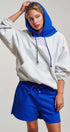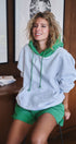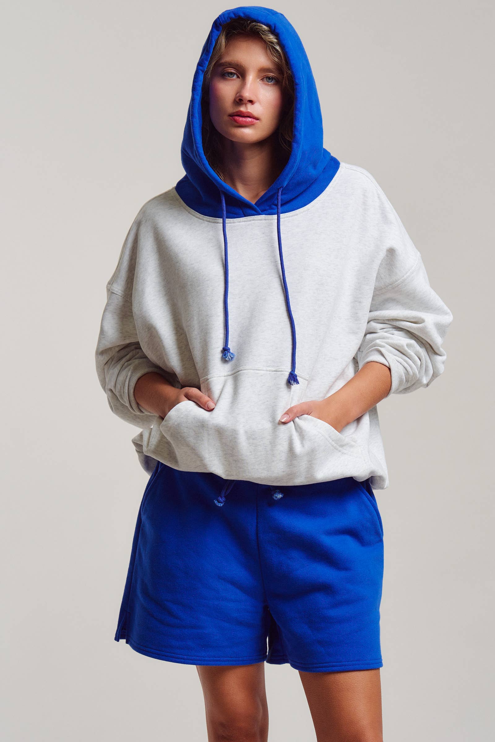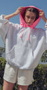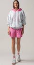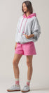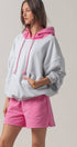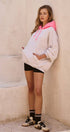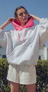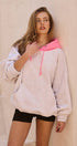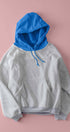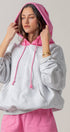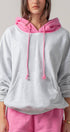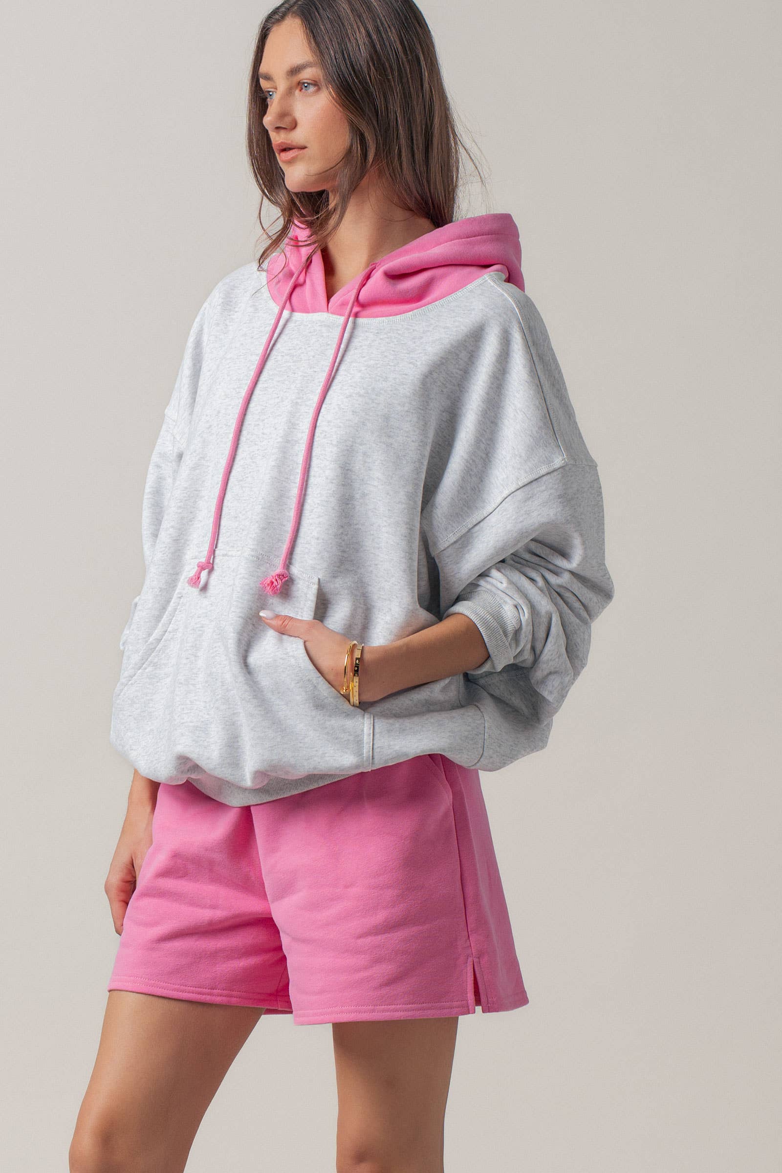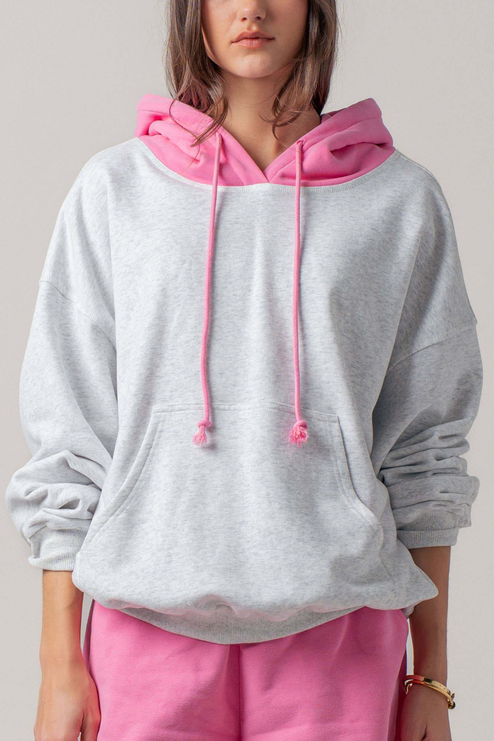 Design: A colorblock hoodie featuring a grey heathered body and a contrasting neon pink hood with matching drawstrings.