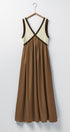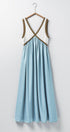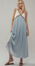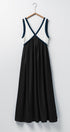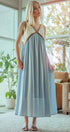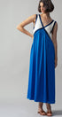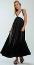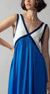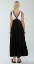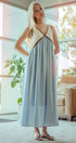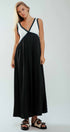 This elegant empire waist maxi dress features a striking contrast V-neckline, fitted bodice, and flowy full-length skirt. Crafted from lightweight fabric and fully lined, it offers both comfort and sophistication—perfect for modest dresses, resort collections, or semi-formal spring 2025 clothing.