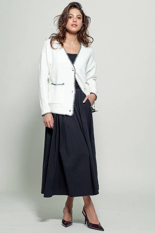 This cozy knit cardigan features a relaxed fit with bold contrast stitching along the edges, patch pockets, and ribbed trim. The button front design and dropped shoulders add a modern touch, making it perfect for layering over your favorite outfits from workdays to weekends. Soft, stretchy yarn ensures comfort and easy movement.