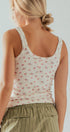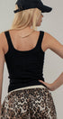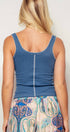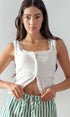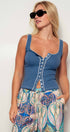 This bold top features a rich orange hue, eye-catching contrast stitching, and silver button details, making it a statement piece. The scoop neckline with picot trim and center back seam add refined touches to this versatile, fitted tank.