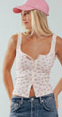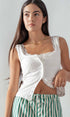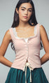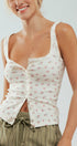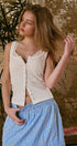 Details: Features contrast stitching, silver button details, a scoop neckline with picot trim, and a center back seam.