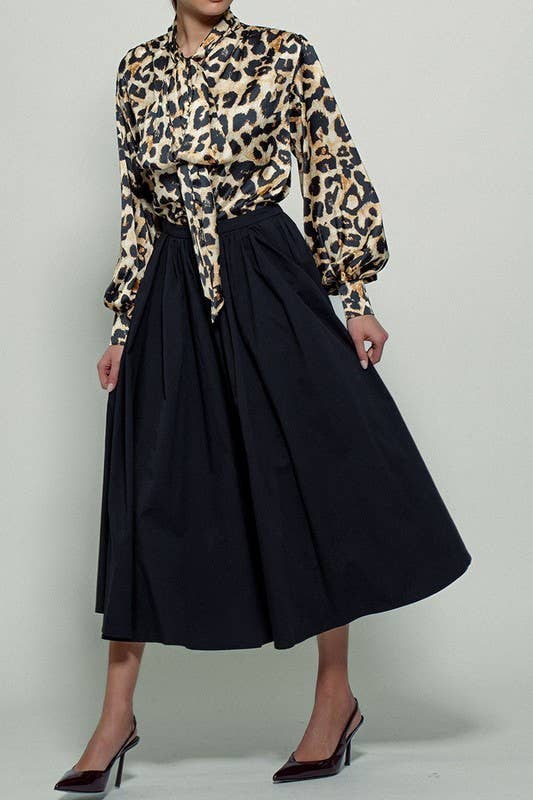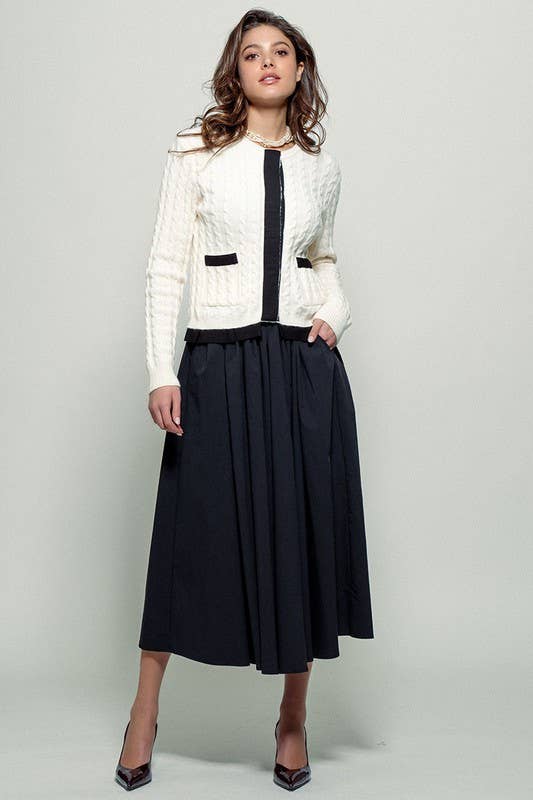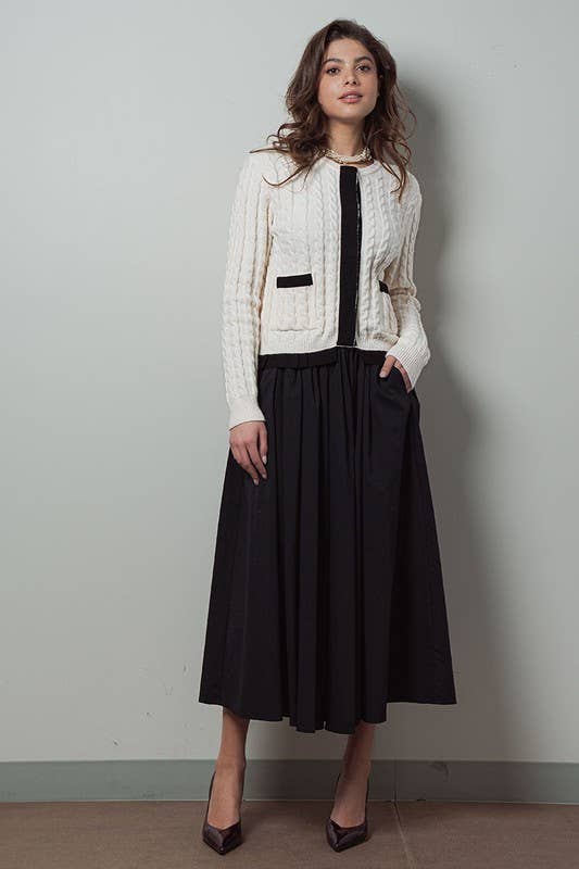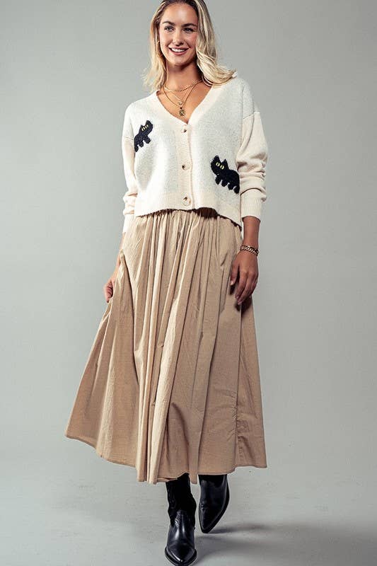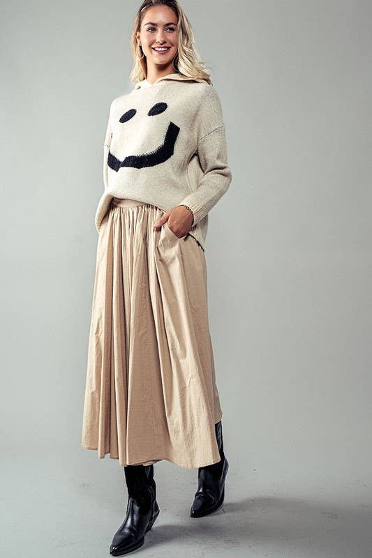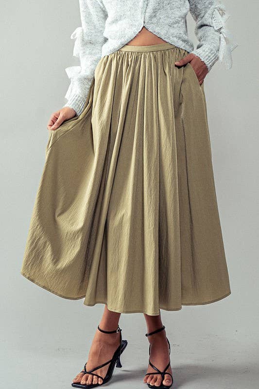 Cotton Blend Pocketed Elastic Waist Midi Skirt