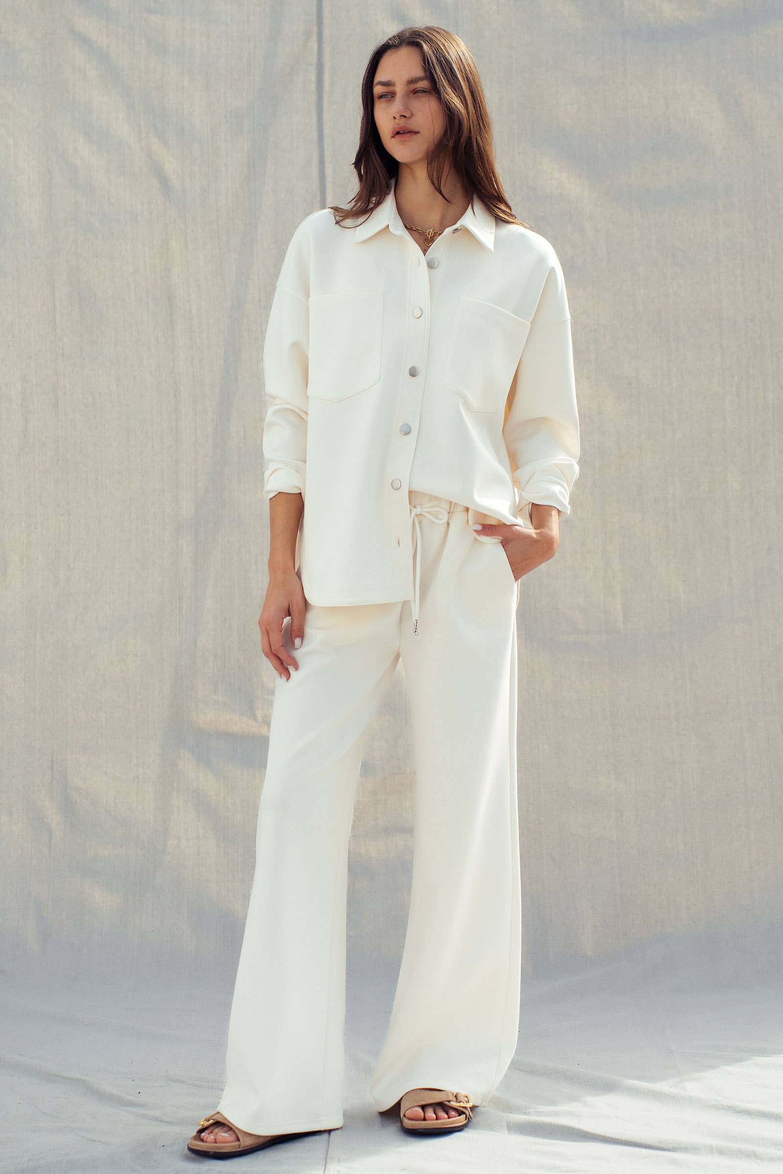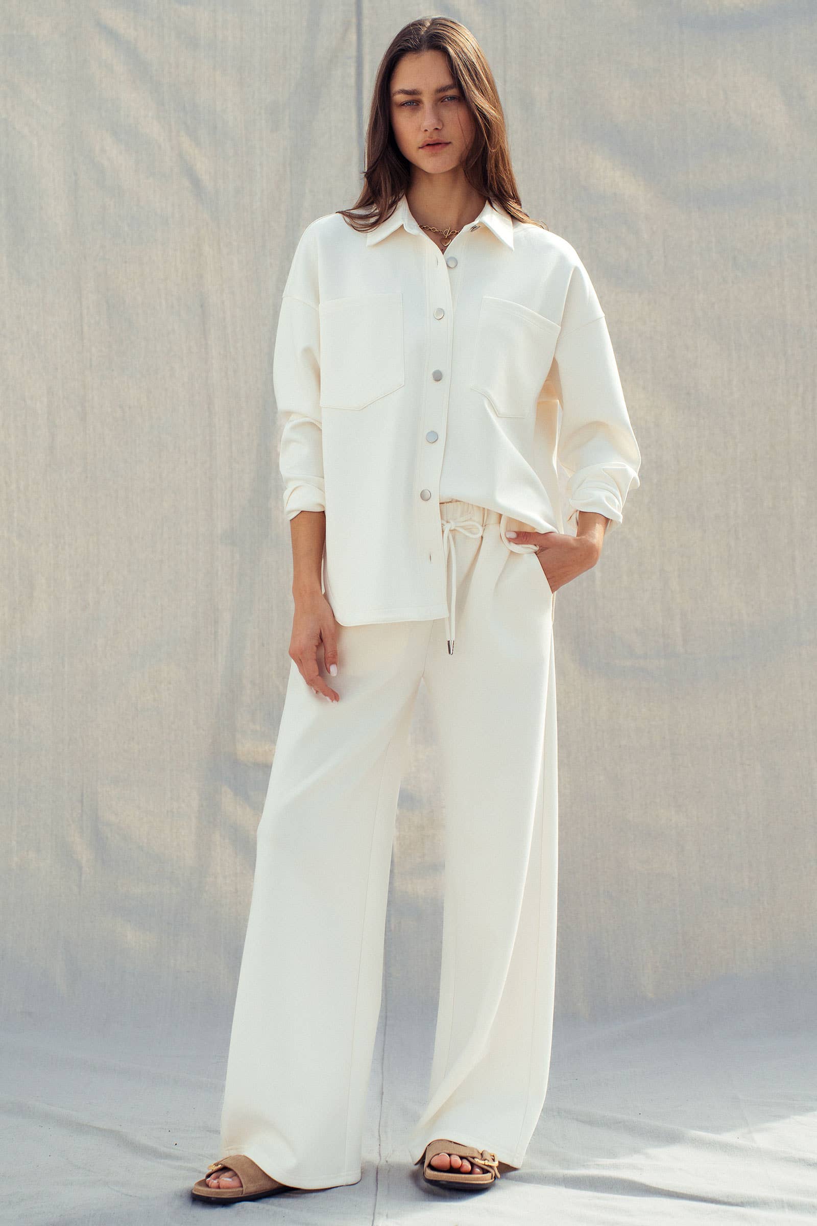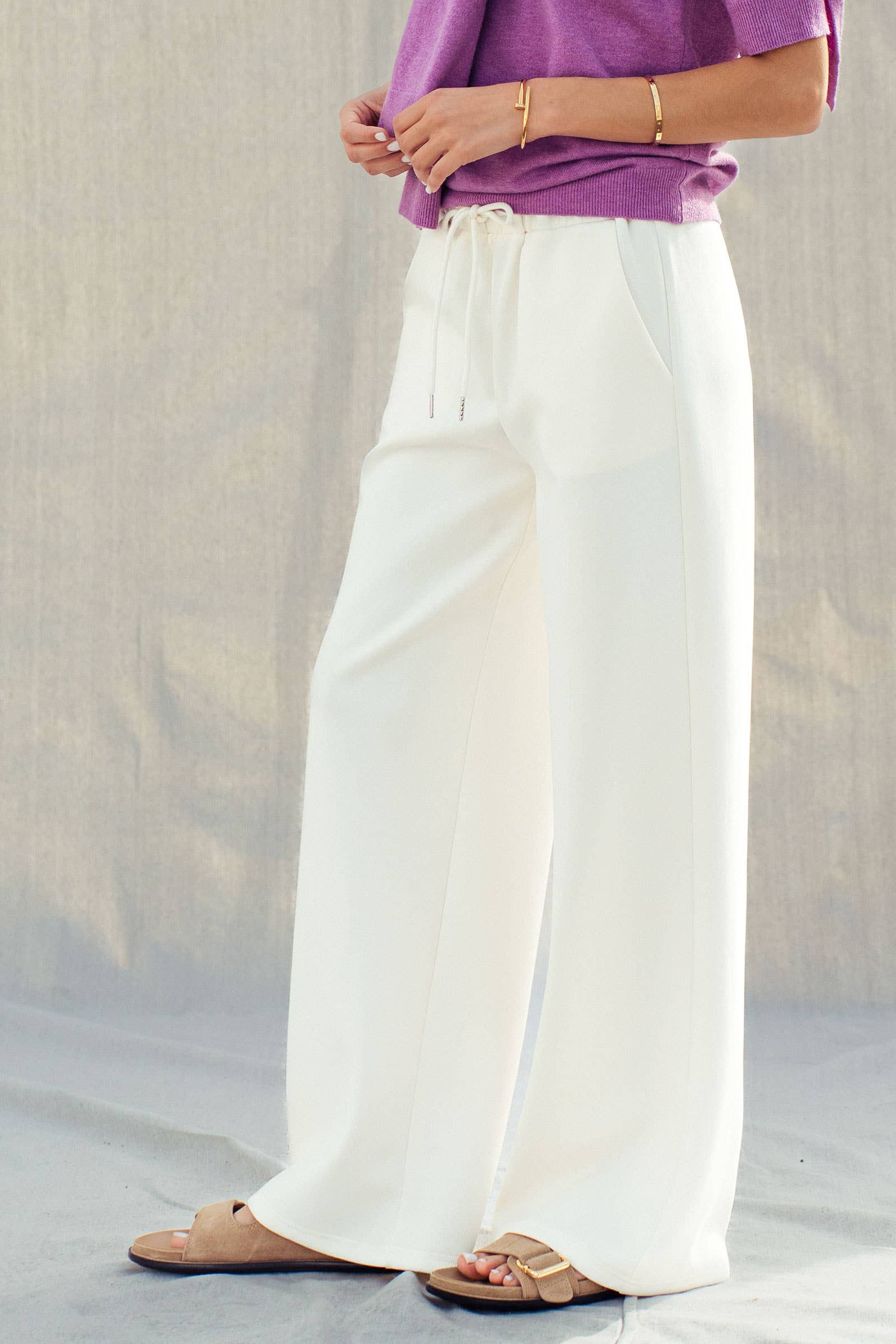 Design & Fit: Features a relaxed, wide-leg silhouette that flows effortlessly from the hip. The waist is defined by a comfortable elastic band and a functional drawstring with silver-tone metal aglets for a premium finish.
