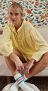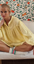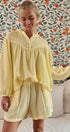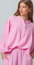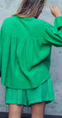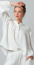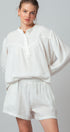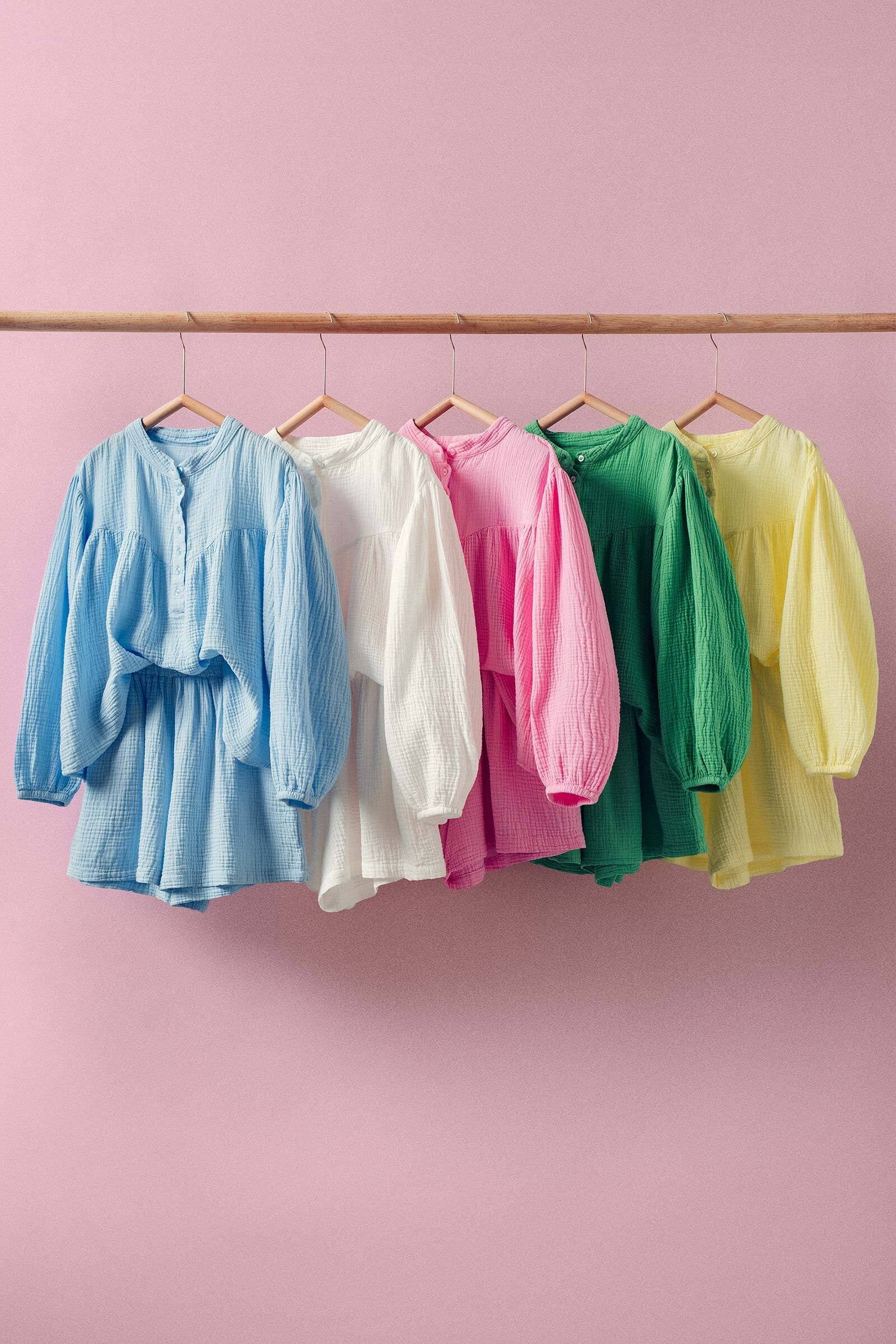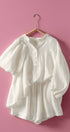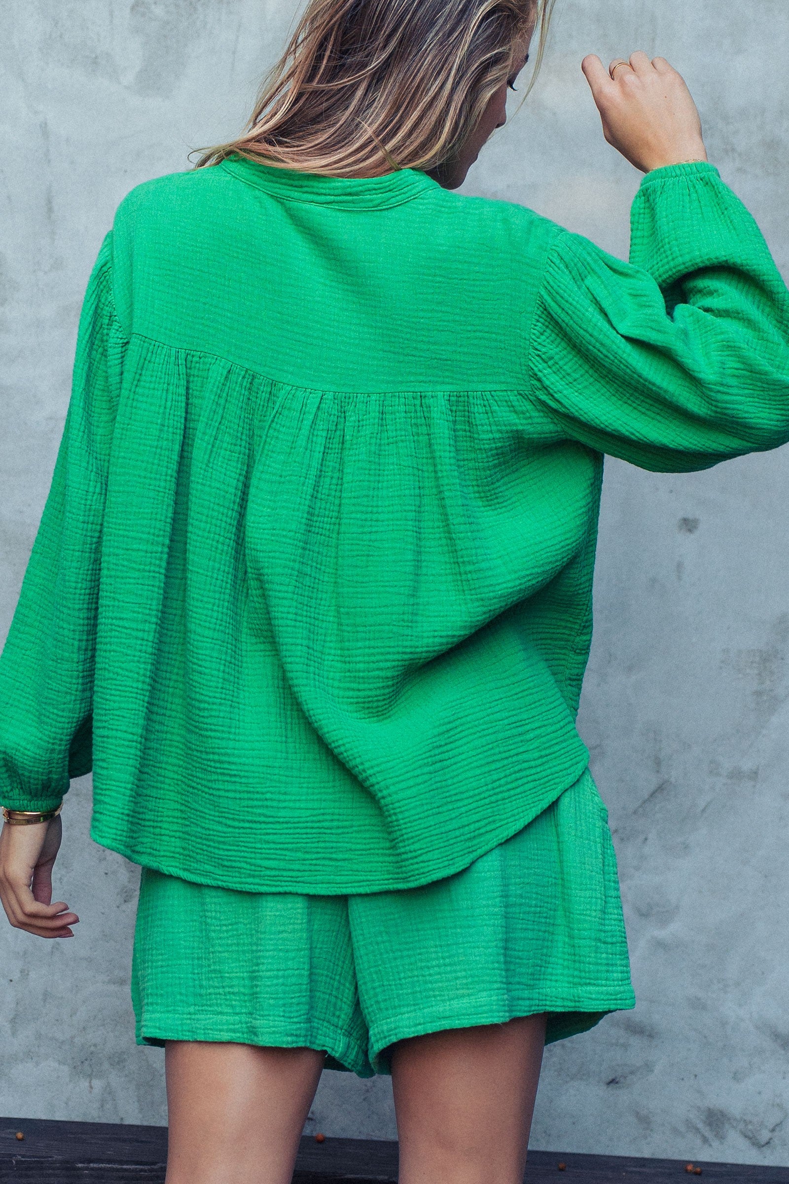 This effortless two-piece set pairs a textured cotton gauze button-down top with matching shorts for a complete ready-to-wear look. The design features voluminous balloon sleeves and a comfortable elastic waistband, offering a breezy aesthetic perfect for resort or lounge styling.