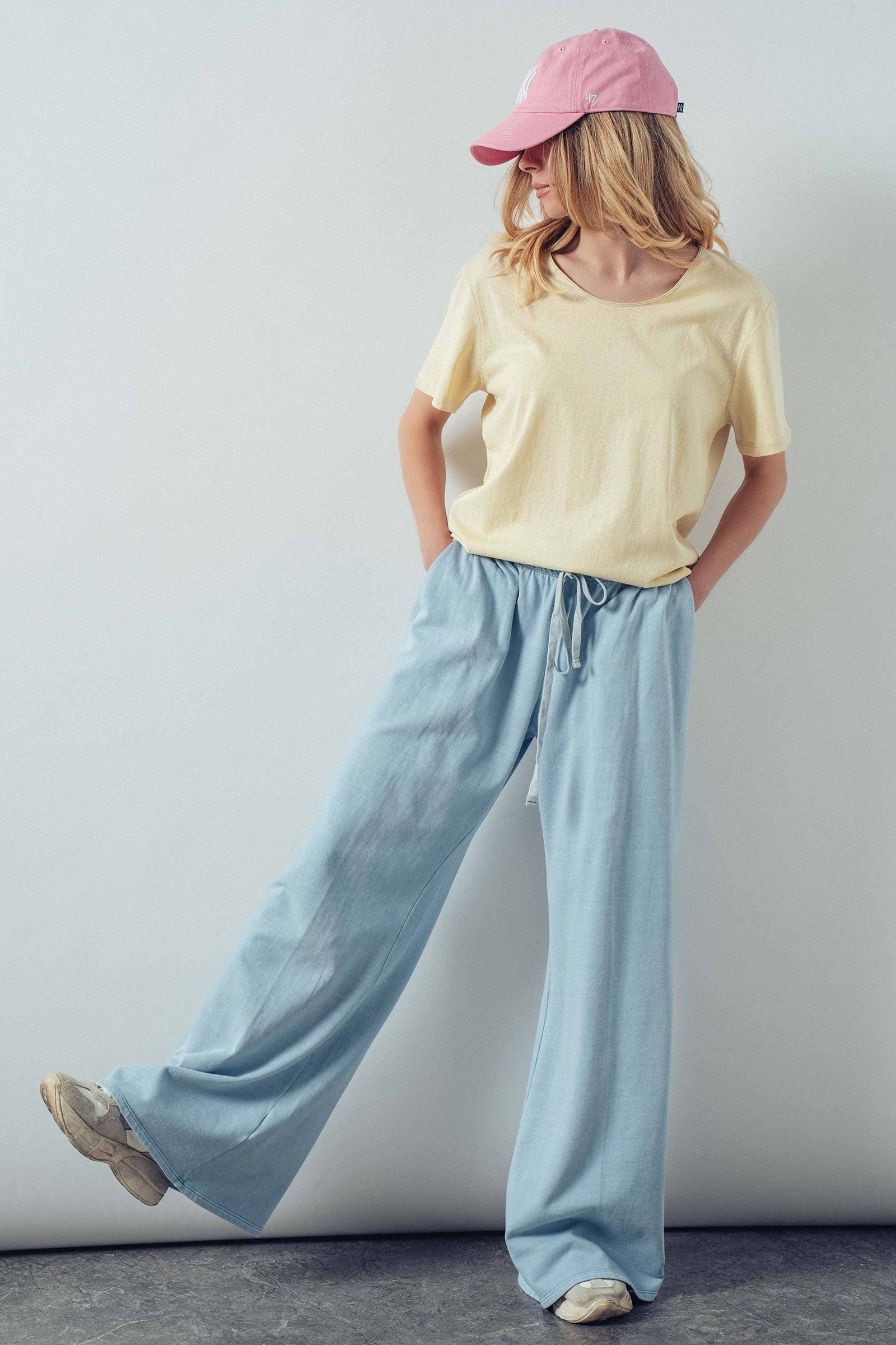 Design: Wide-leg cut with a functional drawstring tie waist