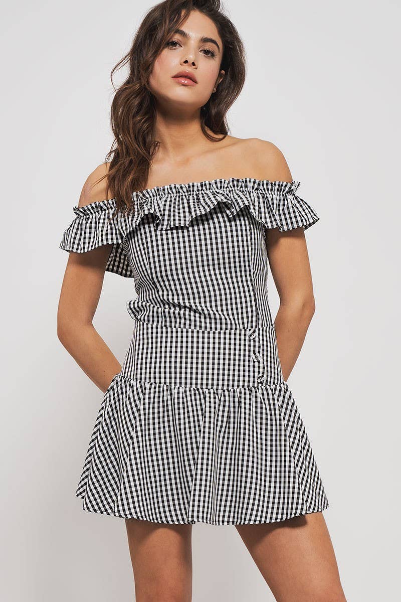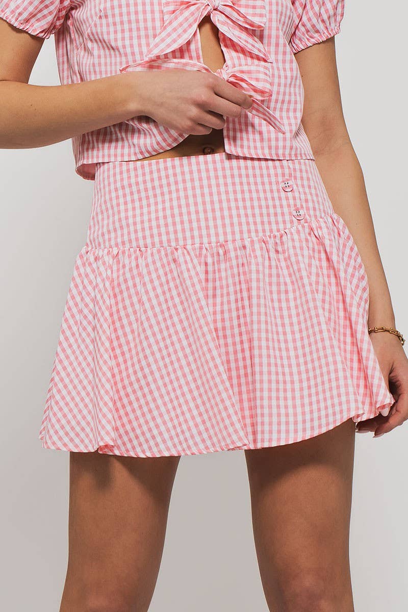 This charming mini skirt features a timeless gingham pattern and feminine details. The lined construction and side button accents create a versatile piece perfect for spring and summer styling. Pair with your favorite top for an effortless look.