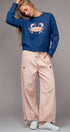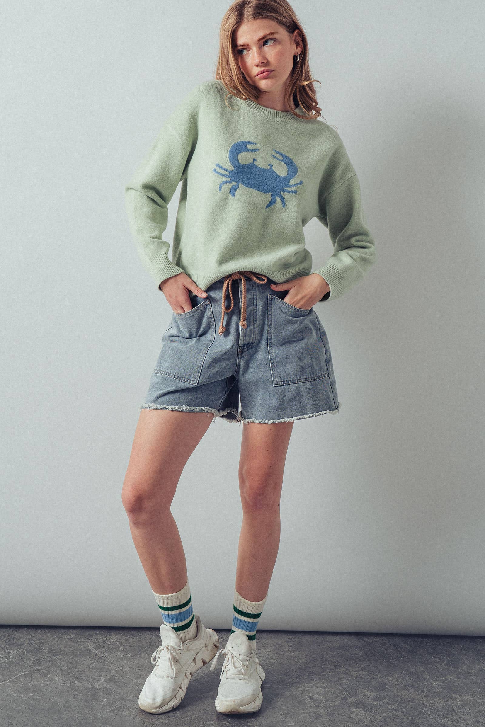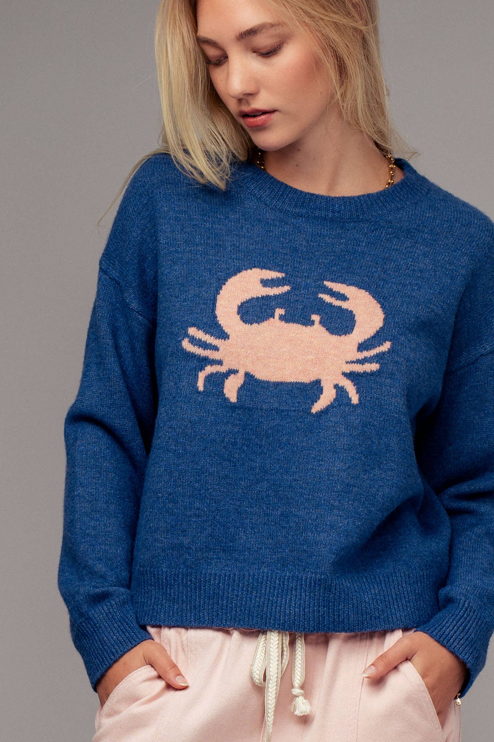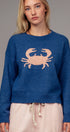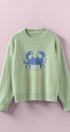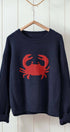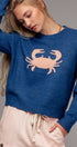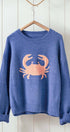 Elevate your spring 2025 clothing and summer wardrobe with this cozy women’s sweater, featuring a bold navy crab graphic at the center front for a playful, coastal-inspired look. The relaxed, slightly oversized fit and soft knit fabric make it perfect for layering over jeans or shorts on cool days or breezy evenings.