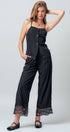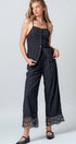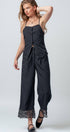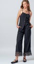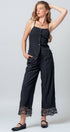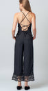 This sophisticated jumpsuit blends romantic details with a relaxed silhouette. Crafted from soft crinkle rayon, it features a strappy open back, delicate lace trim, and wide-leg pants, making it an effortless choice for a night out or elevated casual wear.