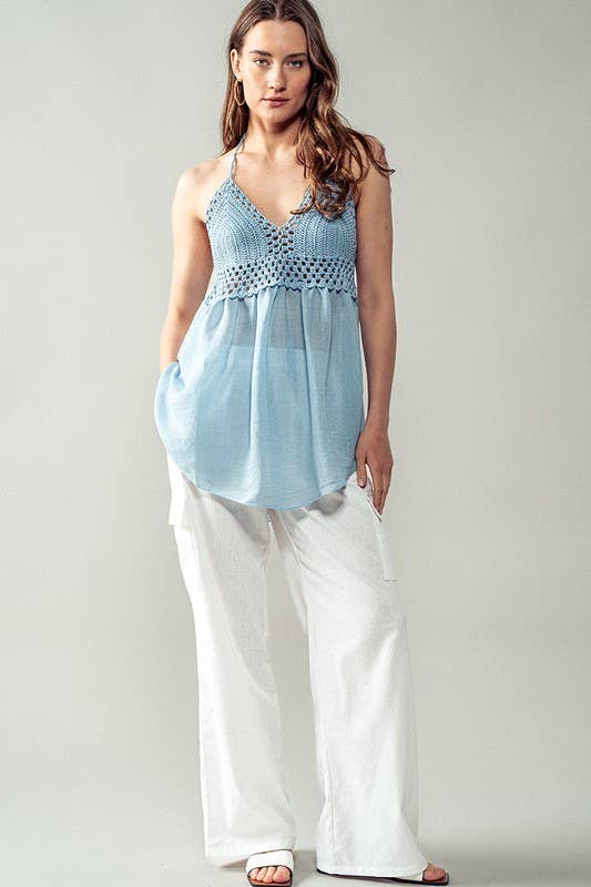 This breezy tunic top features a delicate crochet knit halter neckline and a flowy silhouette for effortless summer styling. Perfect for casual occasions, its lightweight design pairs beautifully with shorts or pants.