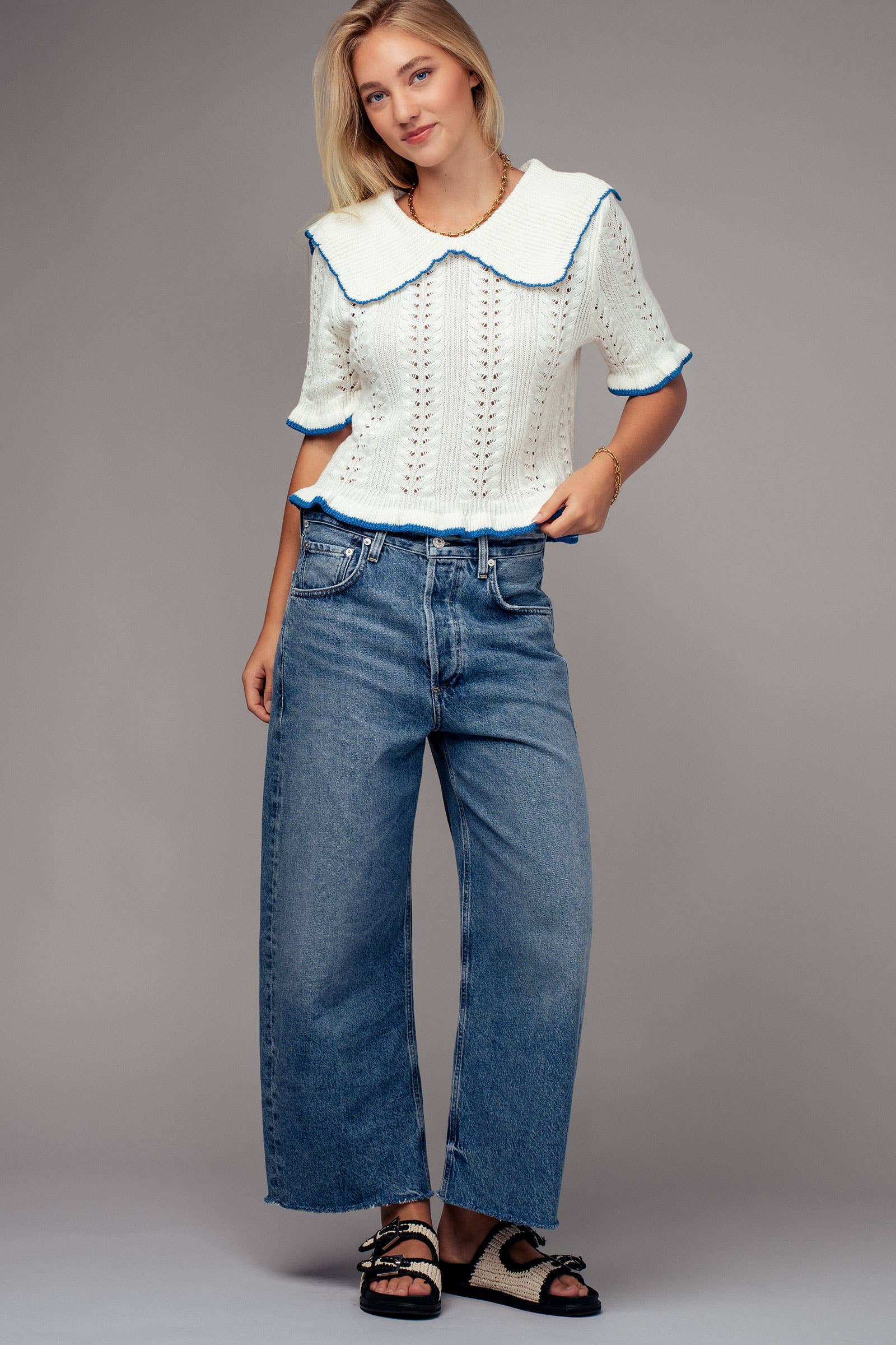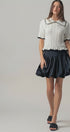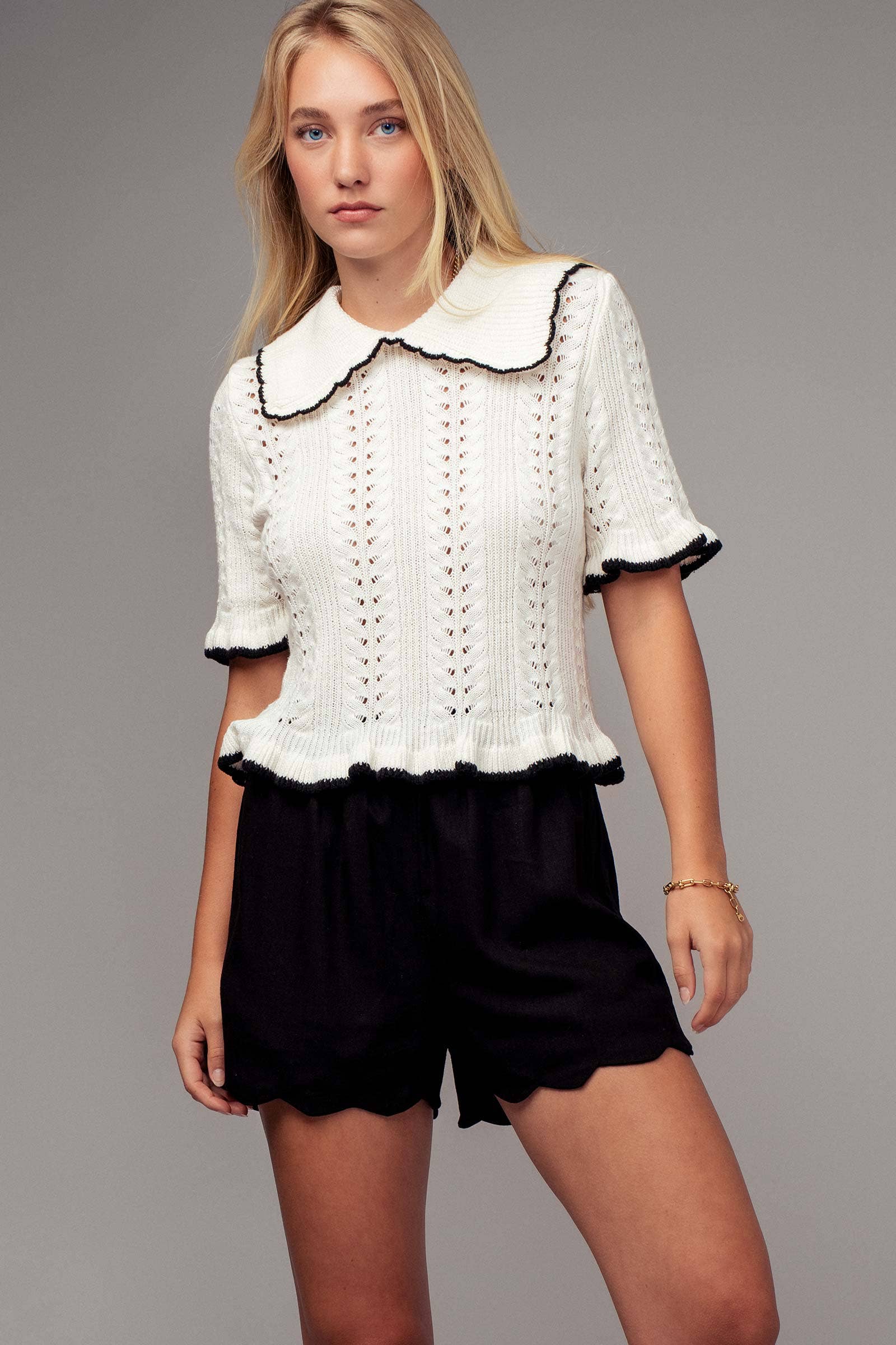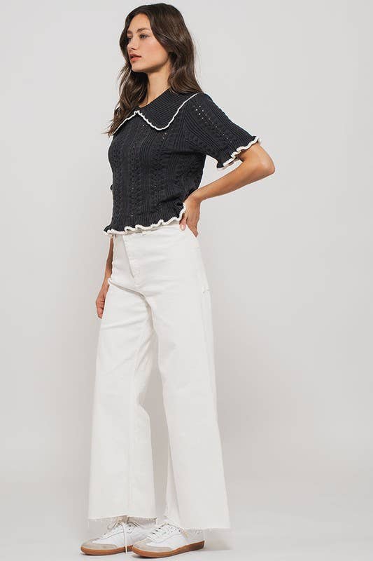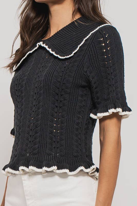 This charming top features a crochet knit design, short sleeves, a collar, and ruffled rib knit cuffs and hem, perfect for adding a touch of whimsy to any outfit. Crafted from a cotton and acrylic blend, it offers comfort and style.
