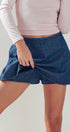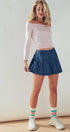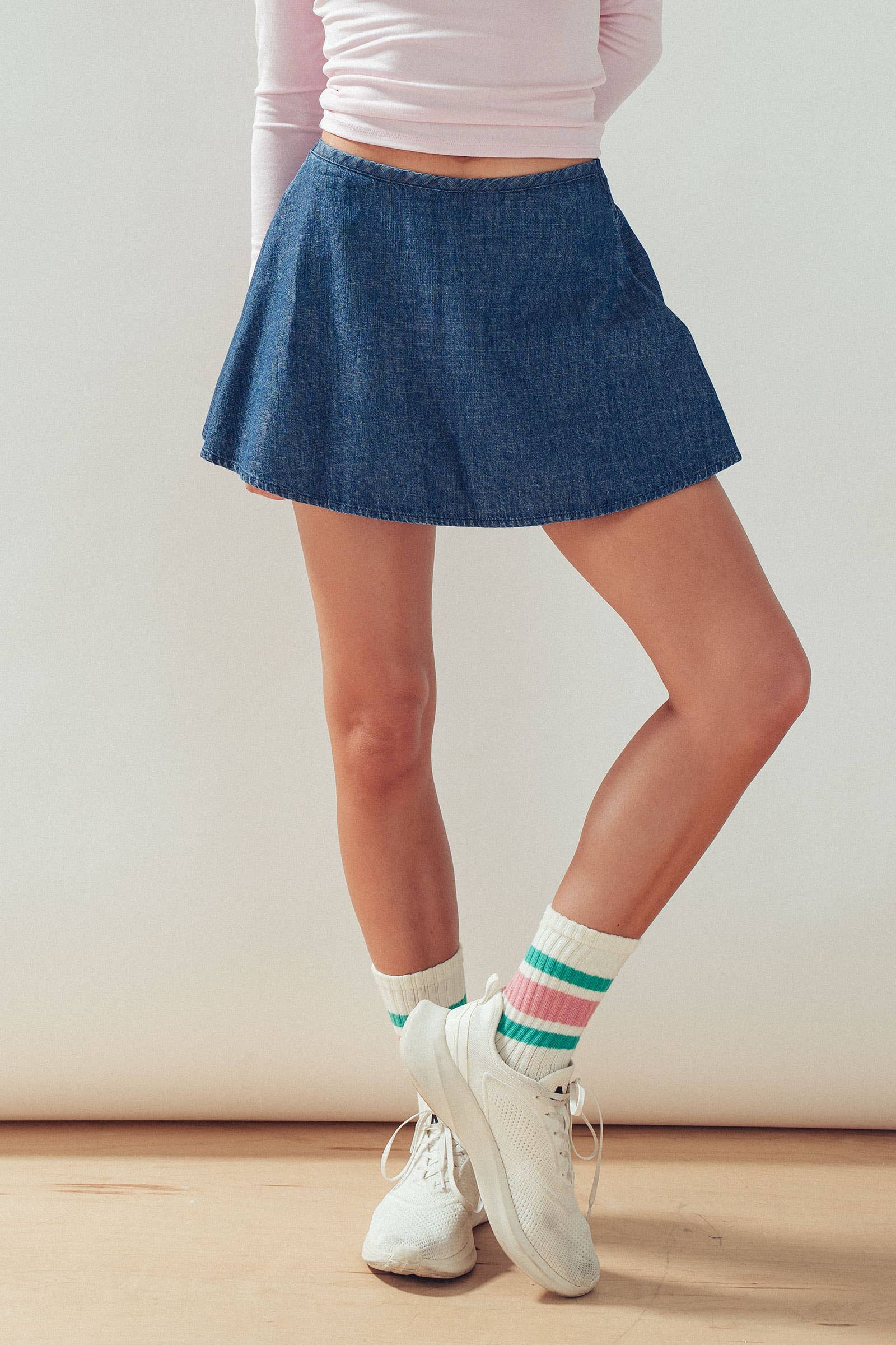 Design: Dark wash denim skort with skirt overlay at front and shorts construction at back