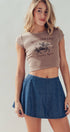 This clever design combines the flirty silhouette of a mini skirt with the comfort and coverage of shorts. Featuring a smooth front waistband and an elasticized back for the perfect fit, it serves as a breezy, feminine alternative to jeans. Style it with boots or sandals to create an effortless western apparel look for sunny days.