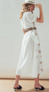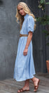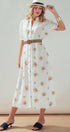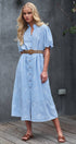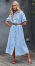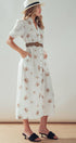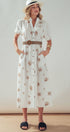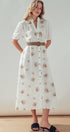This romantic midi dress features delicate floral embroidery scattered across a breathable linen blend fabric. The design showcases a button-front closure, a ruffled collar, and puff sleeves, creating a feminine silhouette that transitions effortlessly from day to evening.