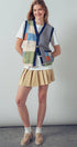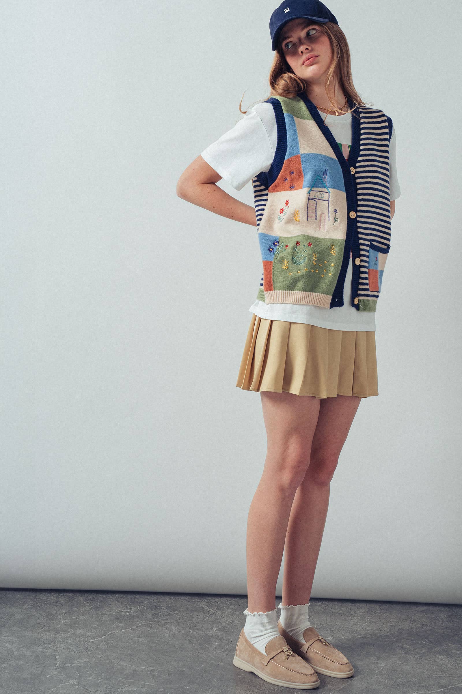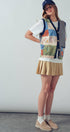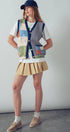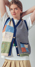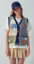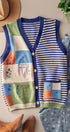 This playful boho-style vest features colorful patchwork blocks, whimsical embroidery, and classic stripes. Designed with a soft knit texture and relaxed fit, it's perfect for layering over dresses, tops, or denim outfits for spring and summer 2025.