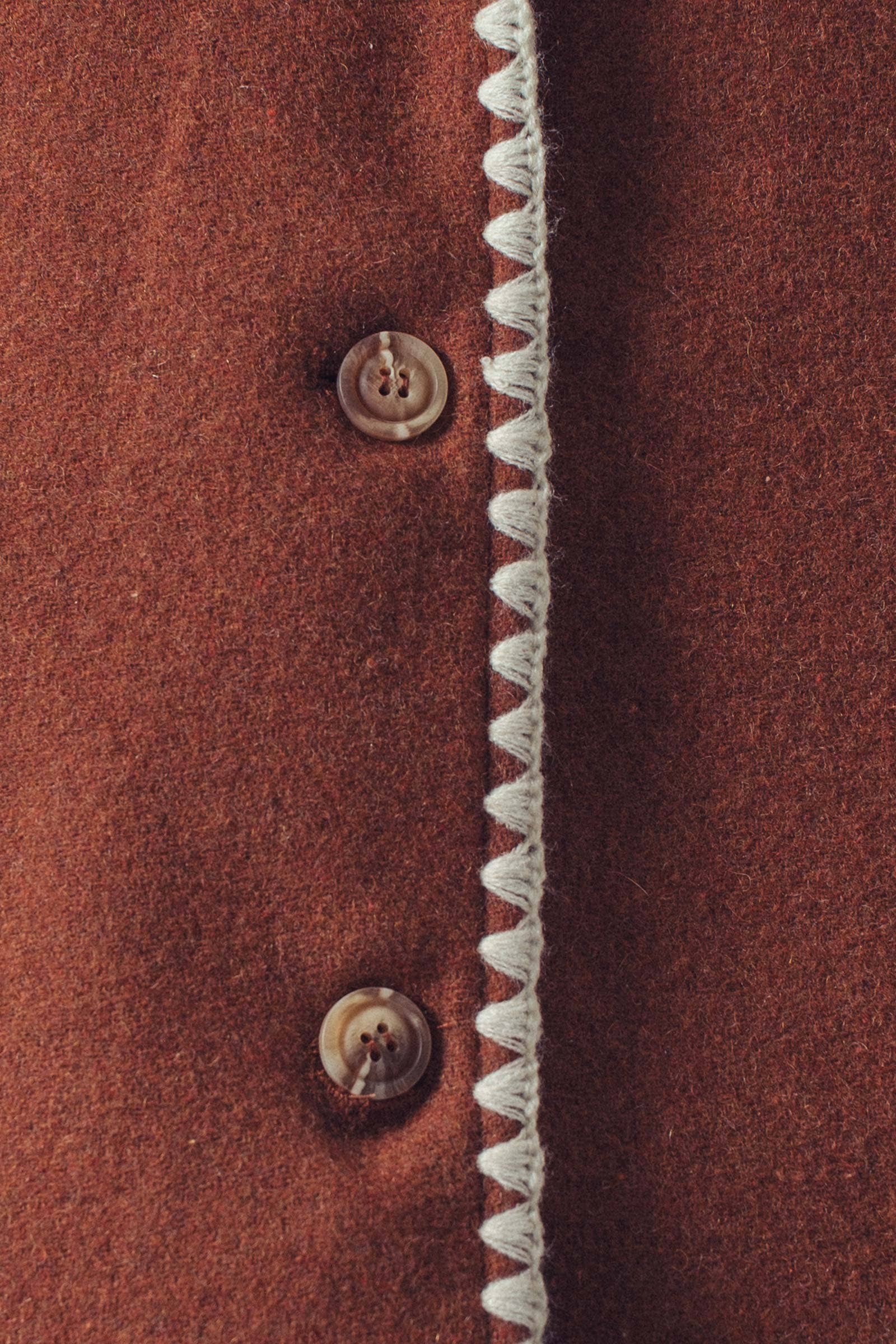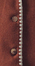 Design: A classic button-front jacket with a structured stand collar and delicate, contrasting embroidered trim along the edges.