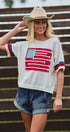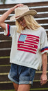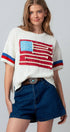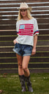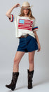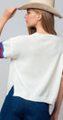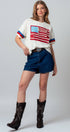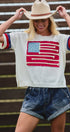 Make a bold graphic statement with this relaxed knit sweater. The boxy top features a striking red, white, and blue flag-inspired appliqué constructed with textured ribbons. Contrast striped cuffs complete this playful, patriotic layering piece.
