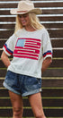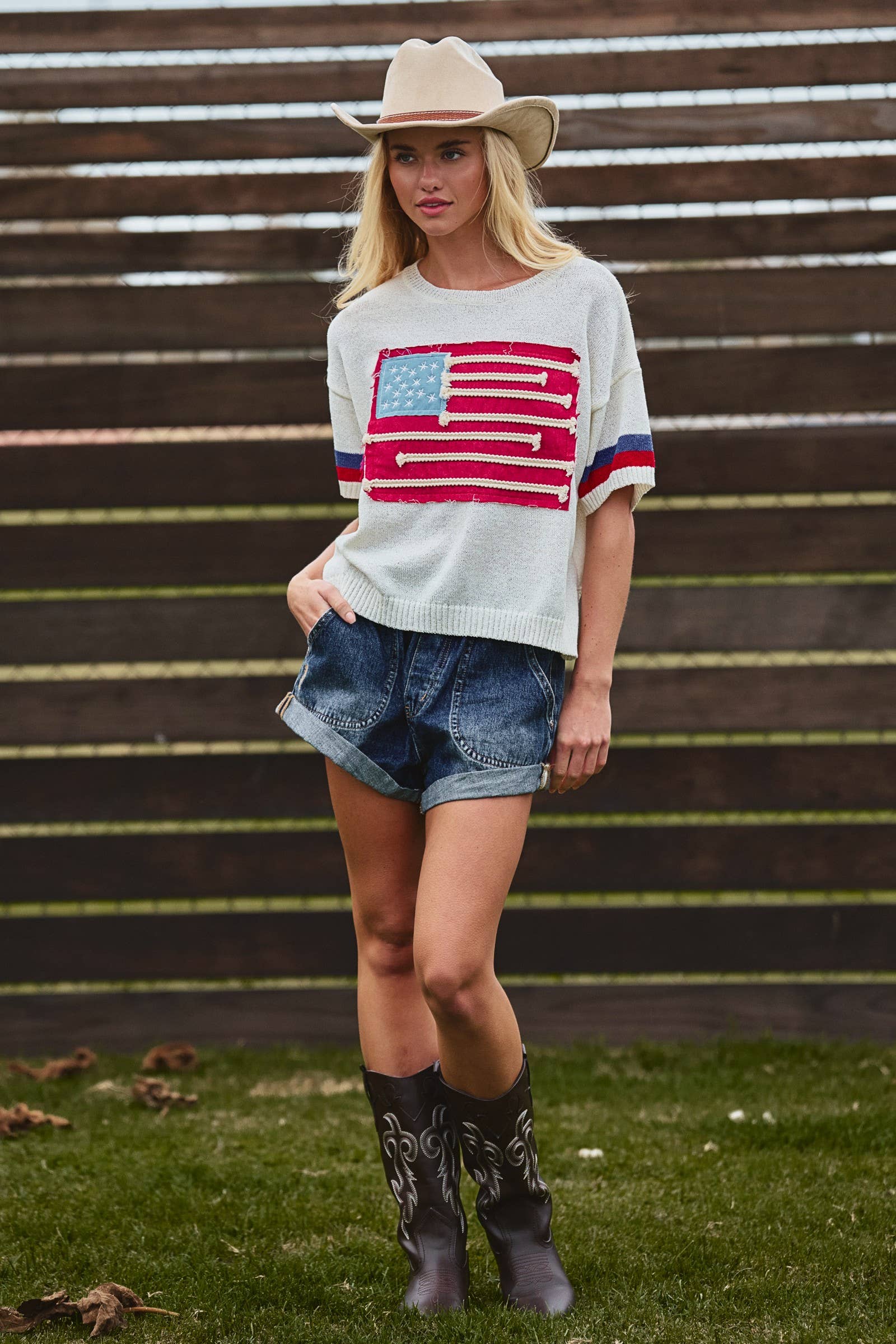 Design: Knit sweater with a textured red, white, and blue flag-inspired applique on the chest.