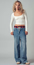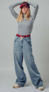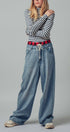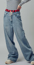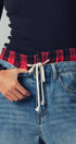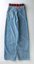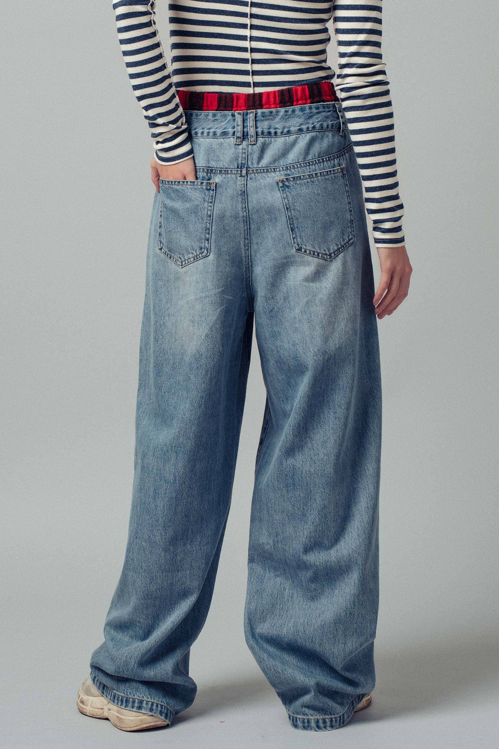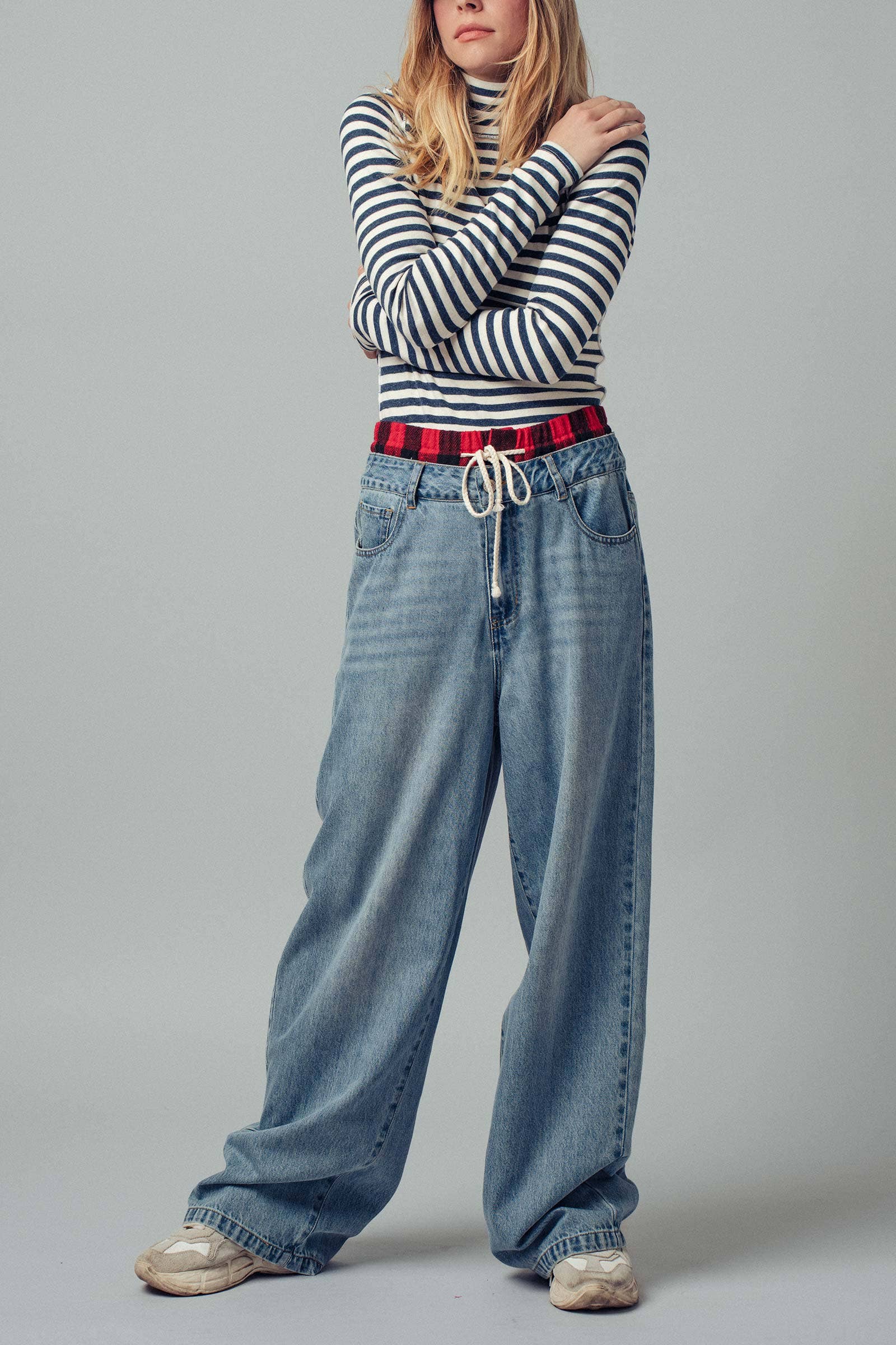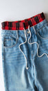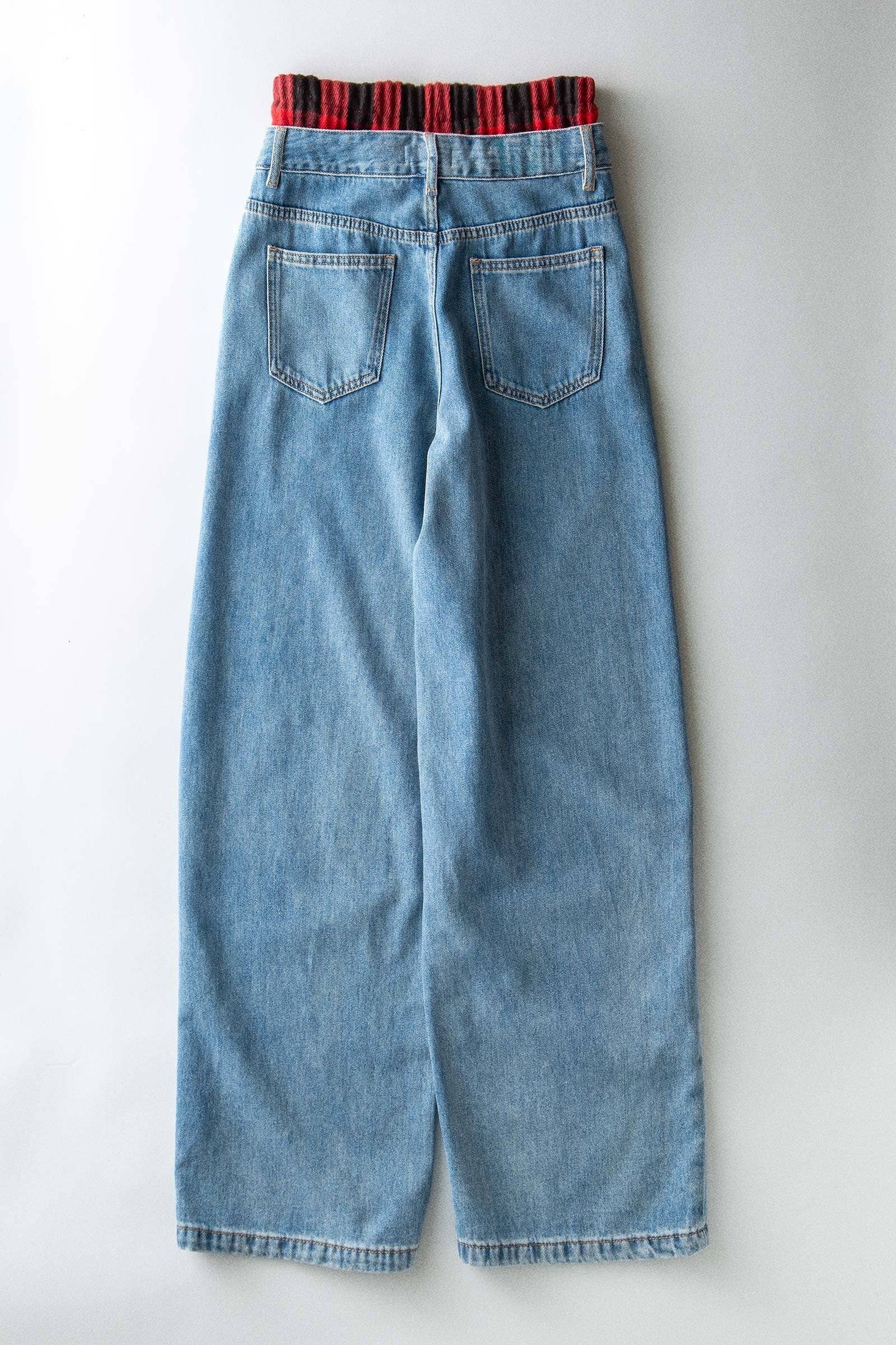 Design: A classic straight-leg denim pant featuring a unique, contrasting waistband in a checked flannel pattern.