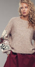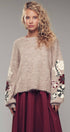 Design: Heathered beige knit with multicolored floral embroidery on the sleeves and ribbed trim