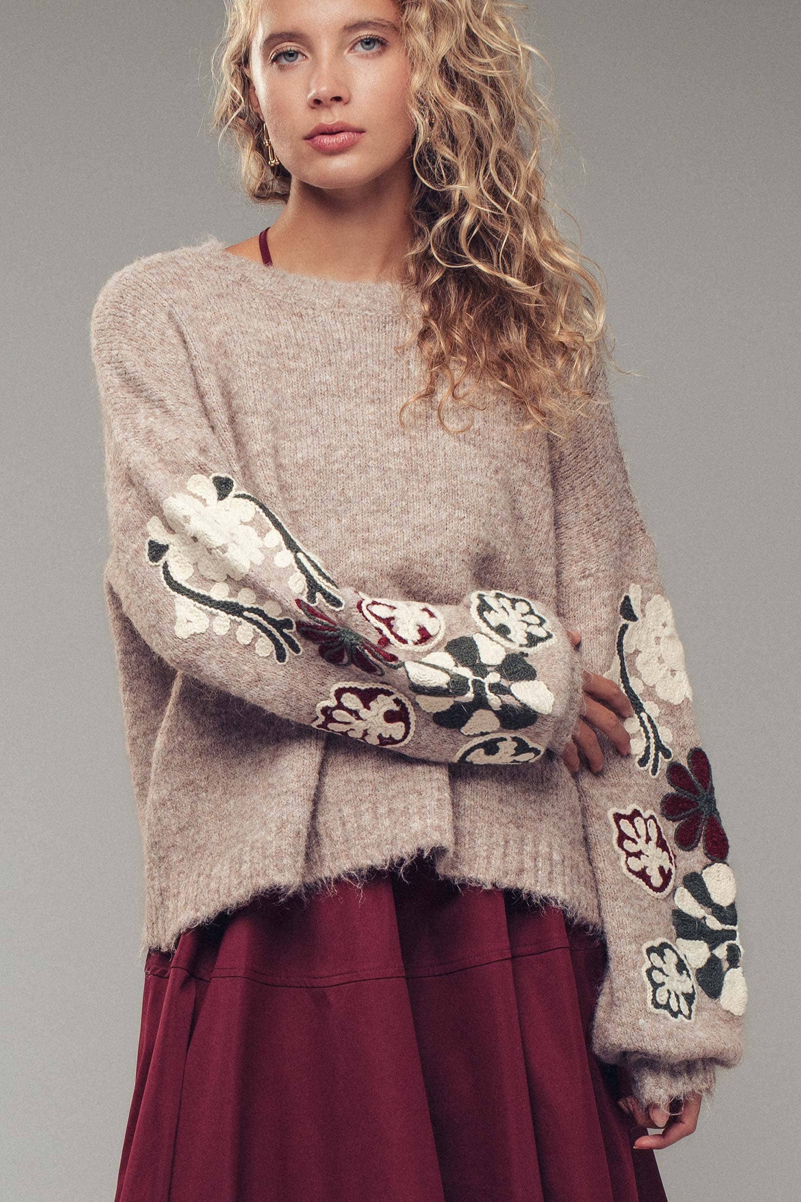 This cozy pullover elevates your collection of sweaters with stunning floral embroidery cascading down the voluminous sleeves. Crafted from a soft, heathered wool-blend knit, it creates a charming focal point that pairs effortlessly with jeans for a romantic, everyday look.