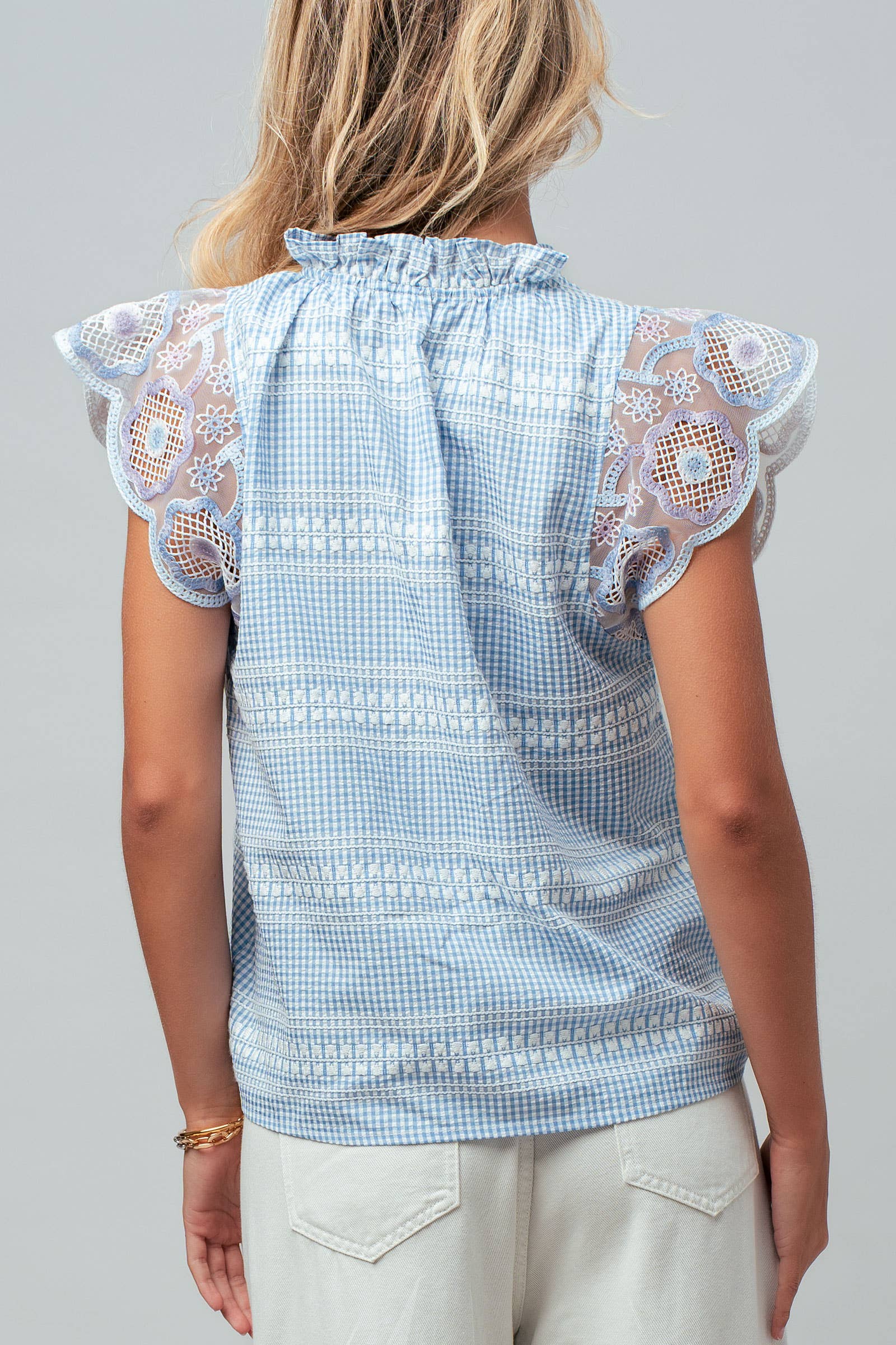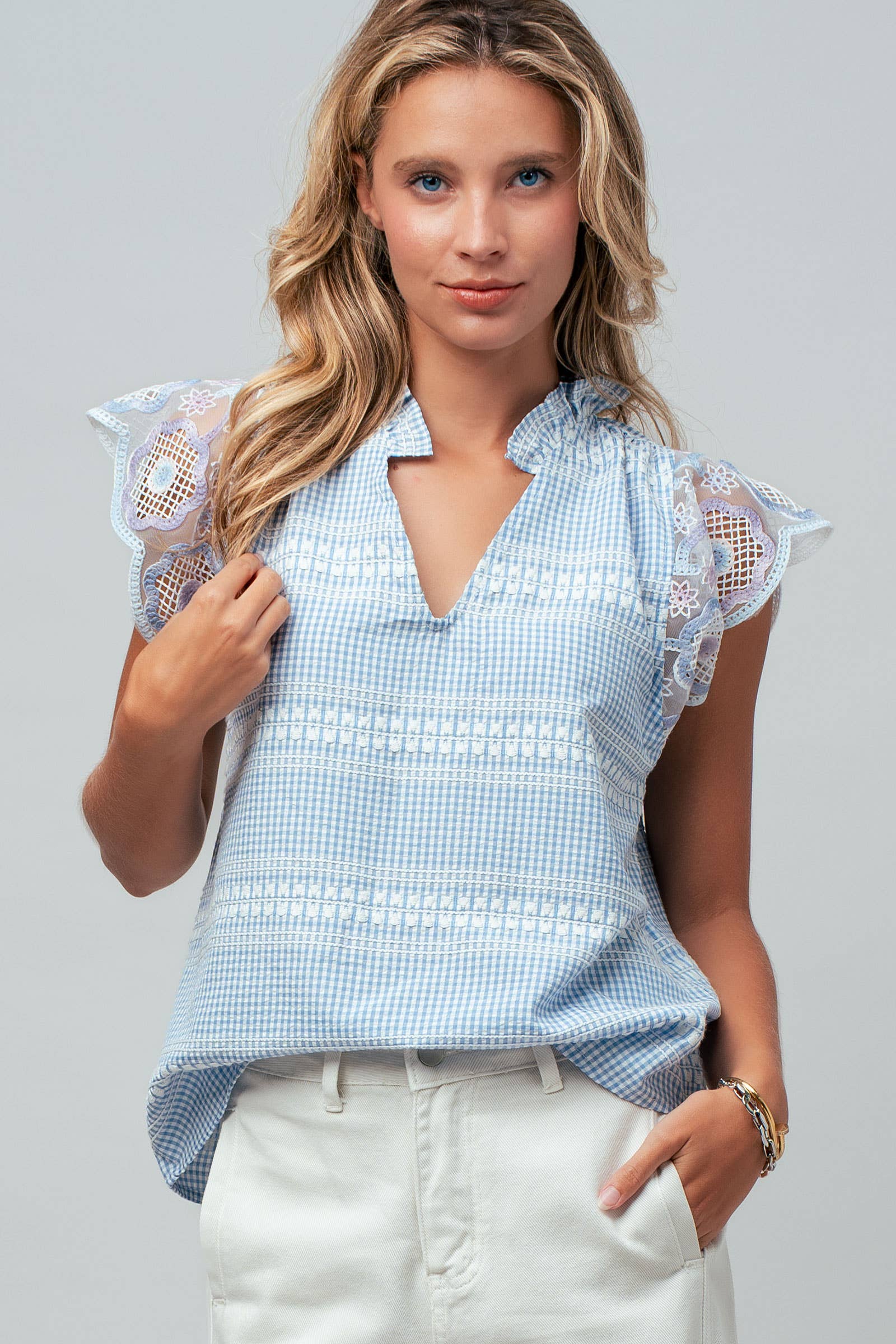 Refresh your spring 2026 clothing lineup with this charming gingham top, featuring delicate floral lace flutter sleeves. Crafted from breathable cotton, this relaxed piece is perfect for western apparel collections or everyday summer styling.