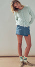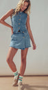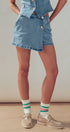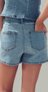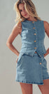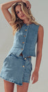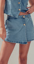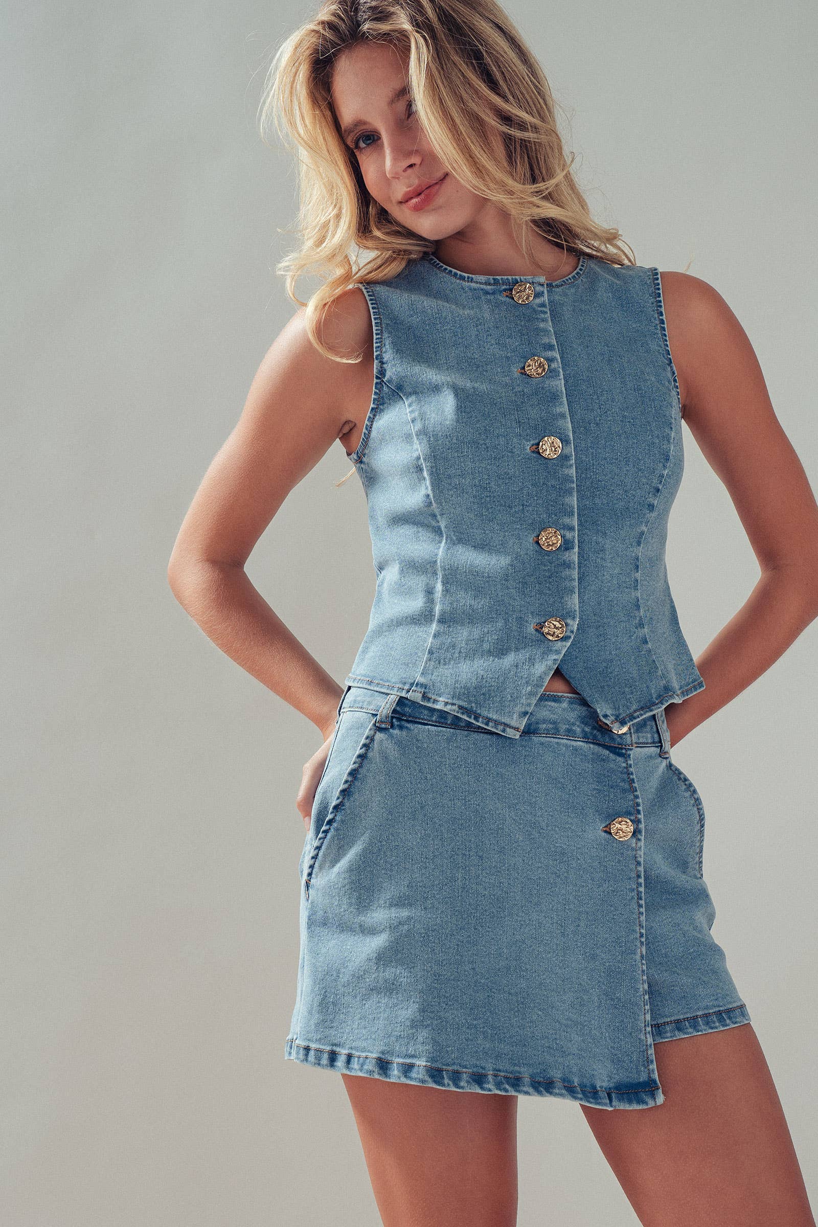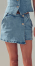 This chic denim skort combines the polished look of a mini skirt with the comfort and functionality of shorts. Featuring an asymmetric front panel secured by signature gold-tone buttons, it creates a cohesive, trend-forward look when styled with the matching vest or simply paired with jeans-style jackets for a modern western apparel vibe.