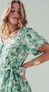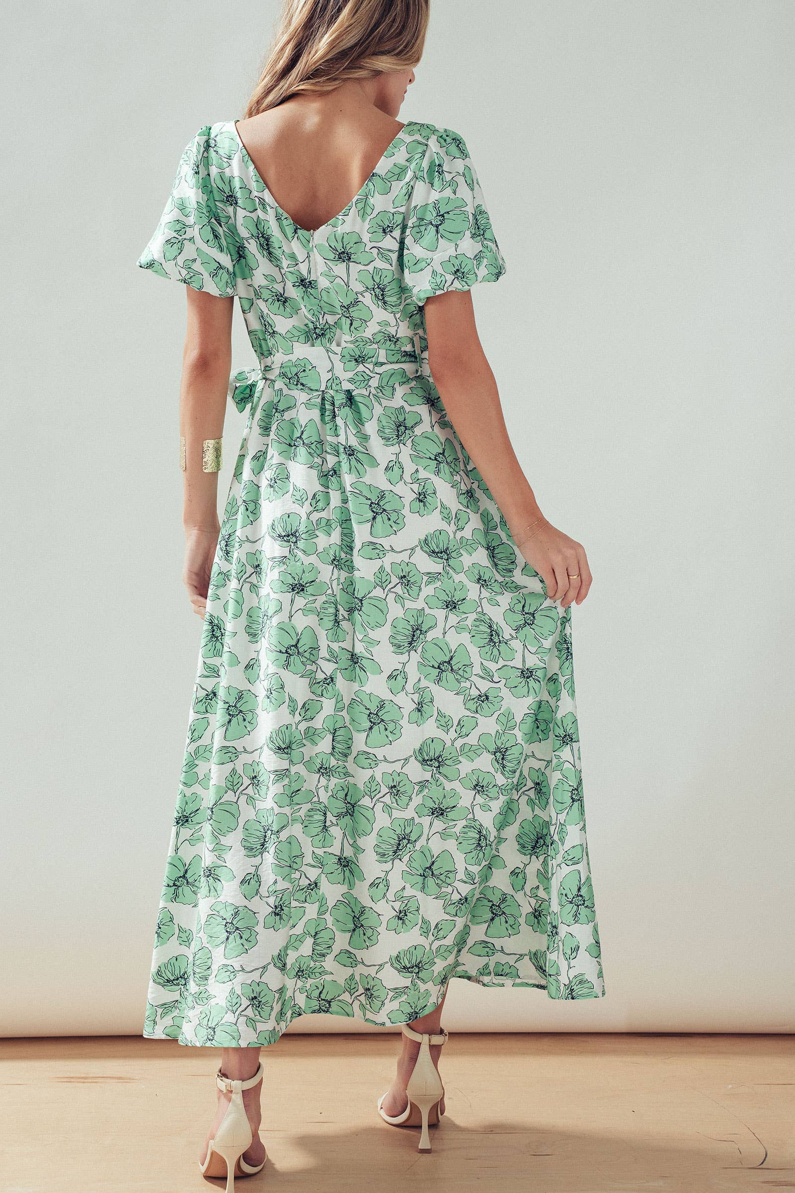 Design: Green and white floral print with puff sleeves and back zipper closure