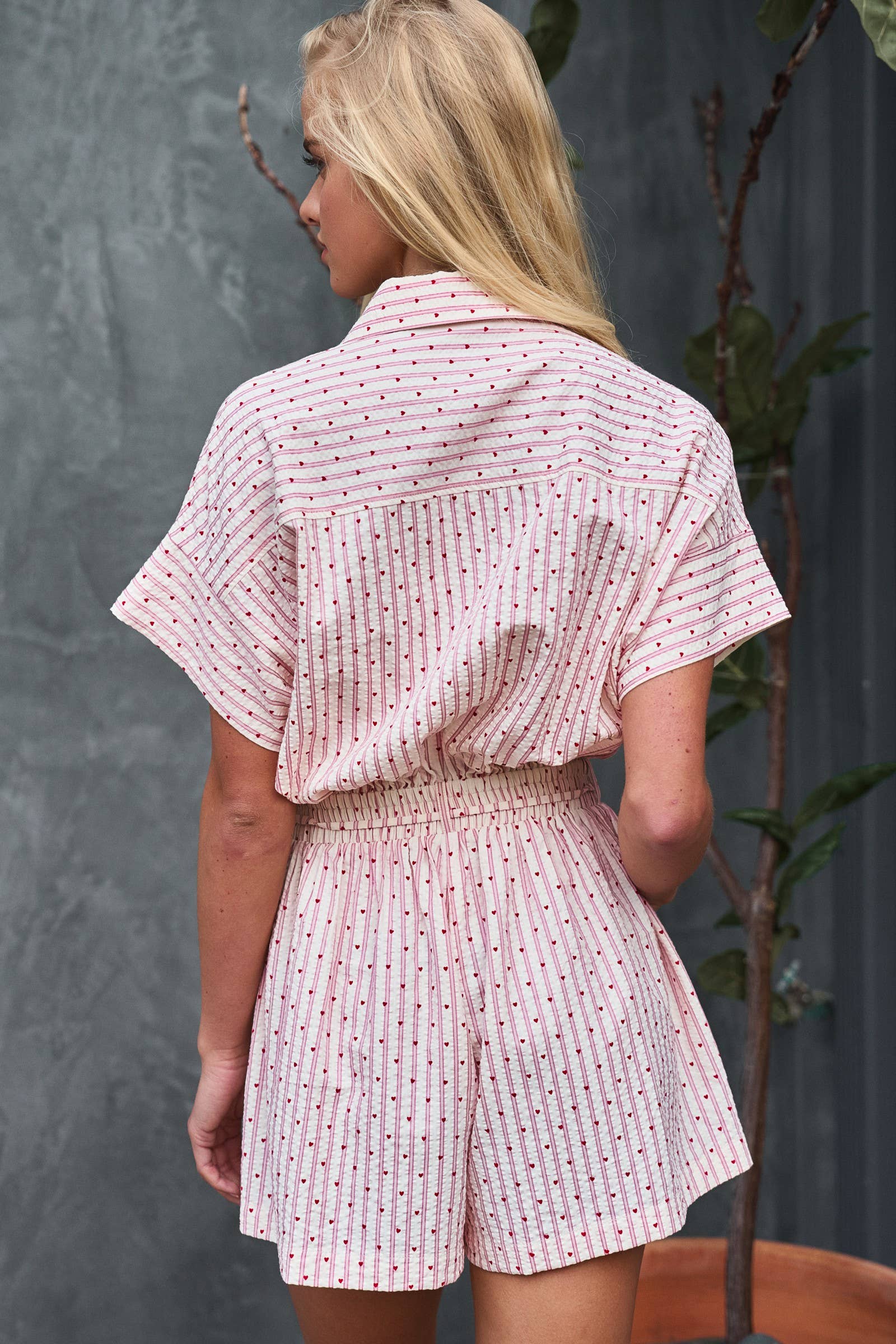 Design: A short-sleeve romper featuring a vertical stripe and heart print, a classic point collar, and a button-front bodice.
