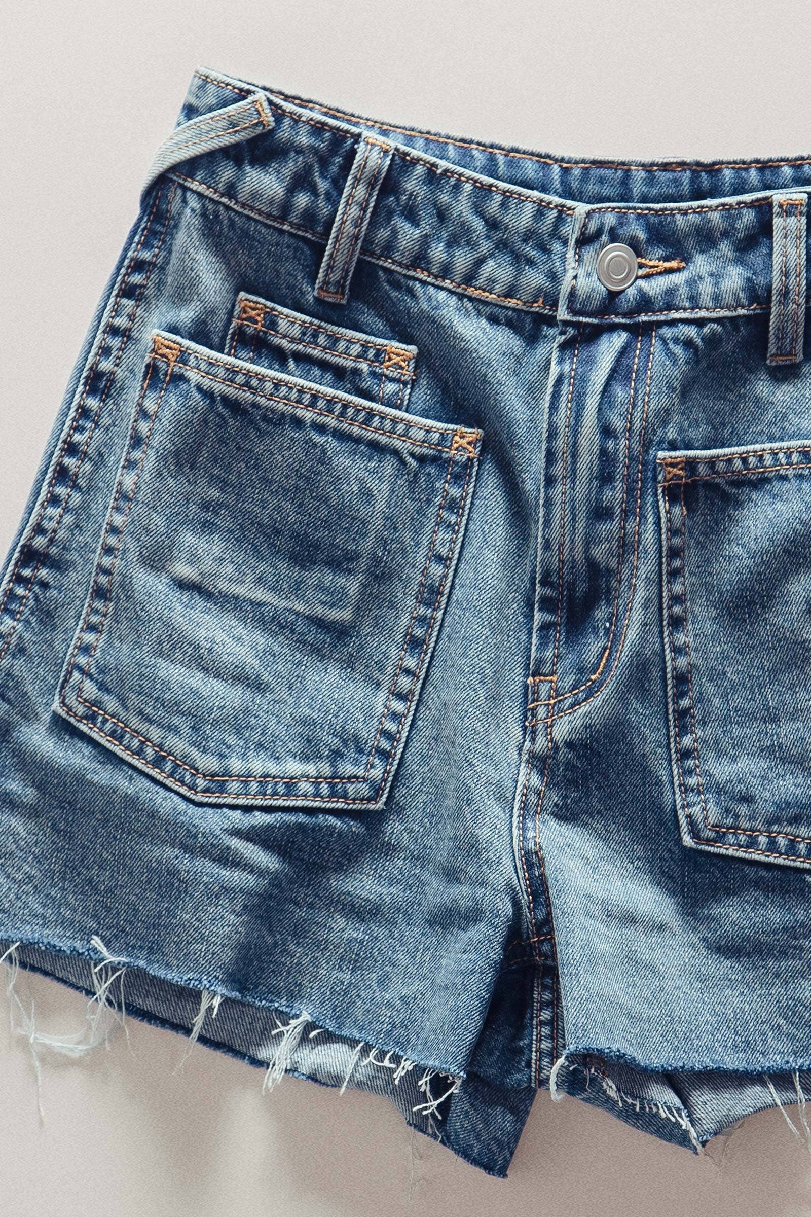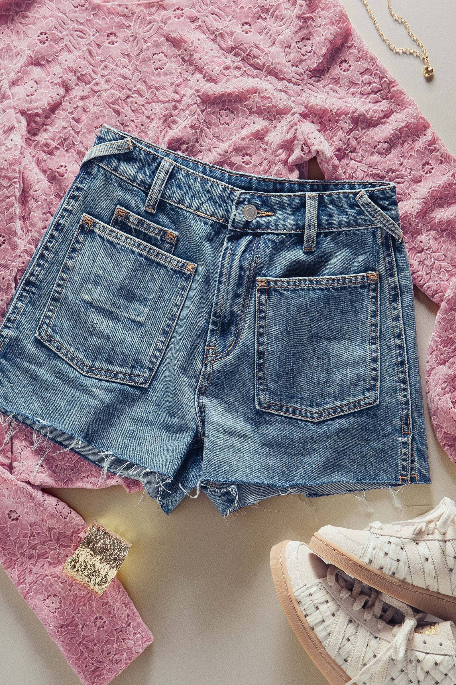 High Rise Patch Pocket Raw Hem Denim Shorts
