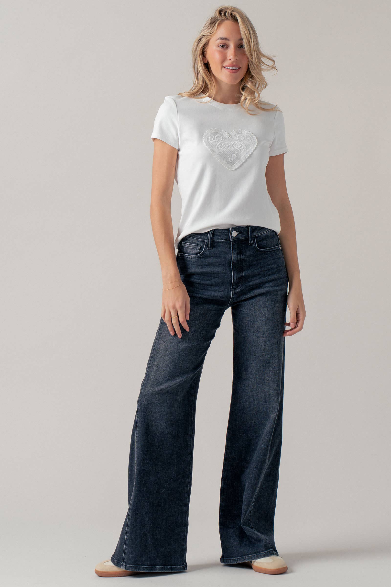 This soft cotton blend tee features a charming lace heart appliqué for a sweet, textured touch. It pairs perfectly with jeans or denim shorts for an effortless, everyday casual look.