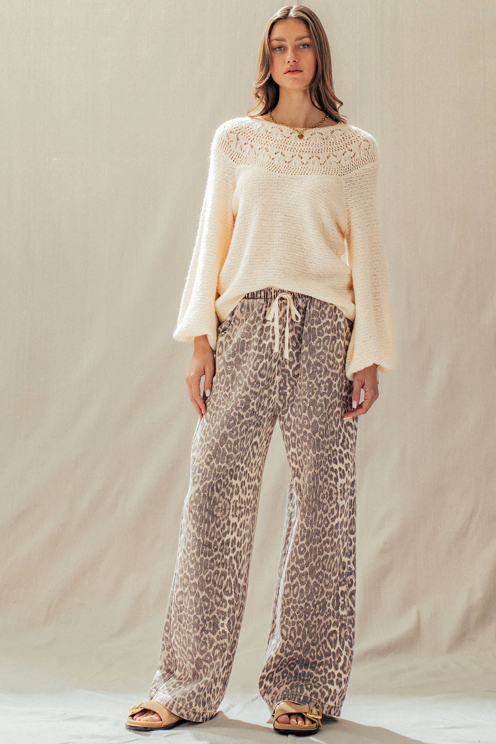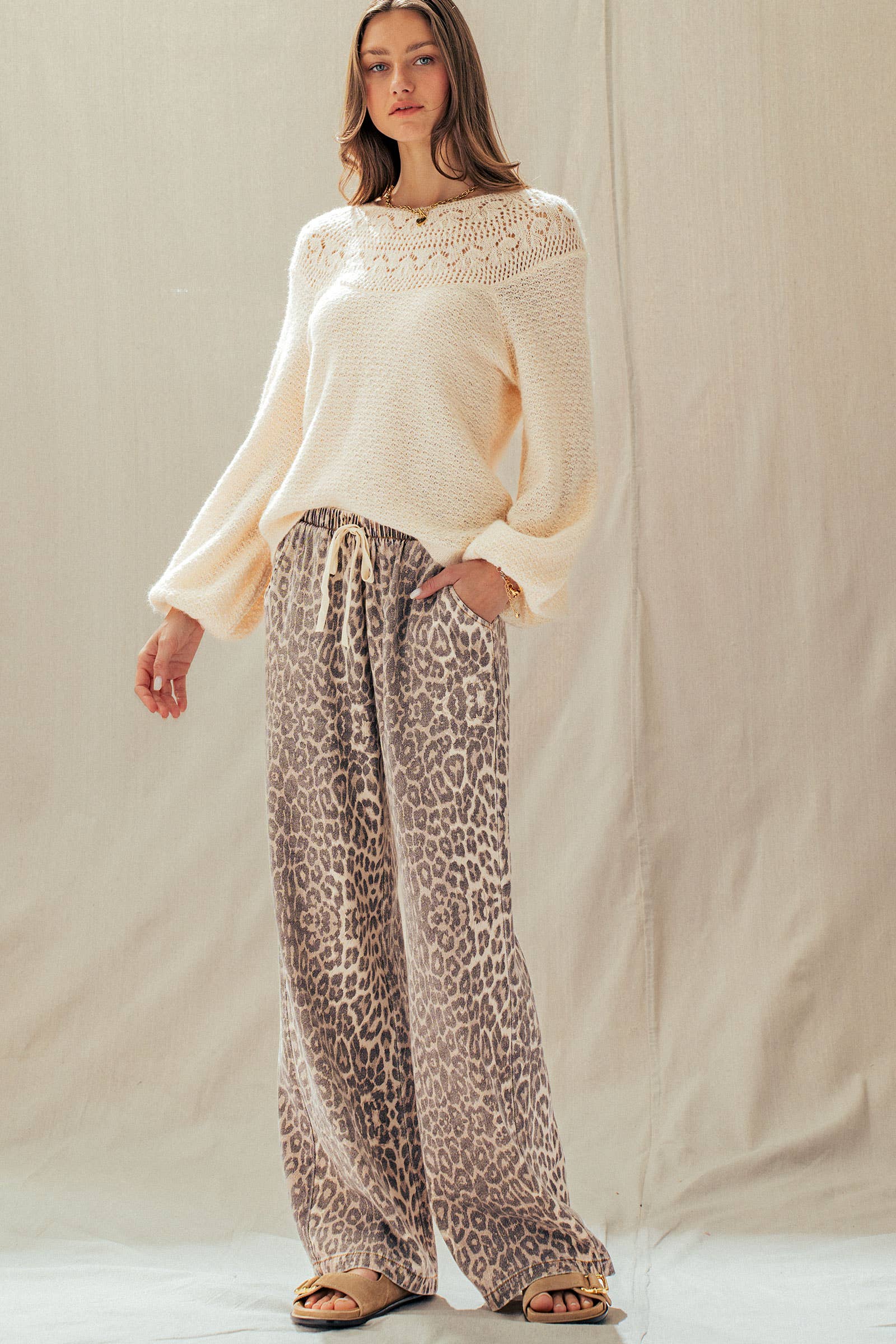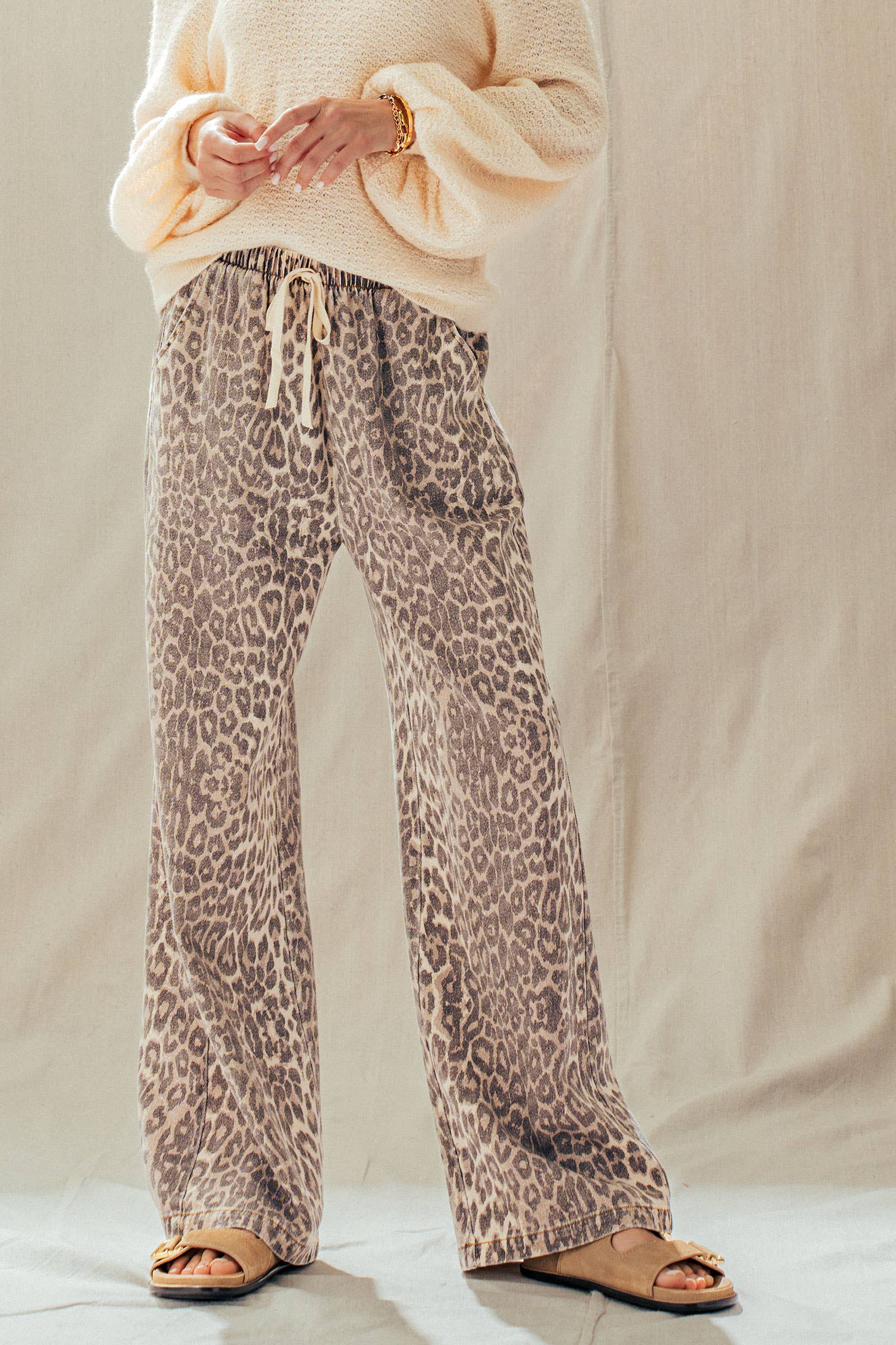 Leopard Print Wide Leg Cotton Pants Drawstring