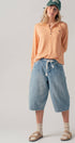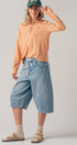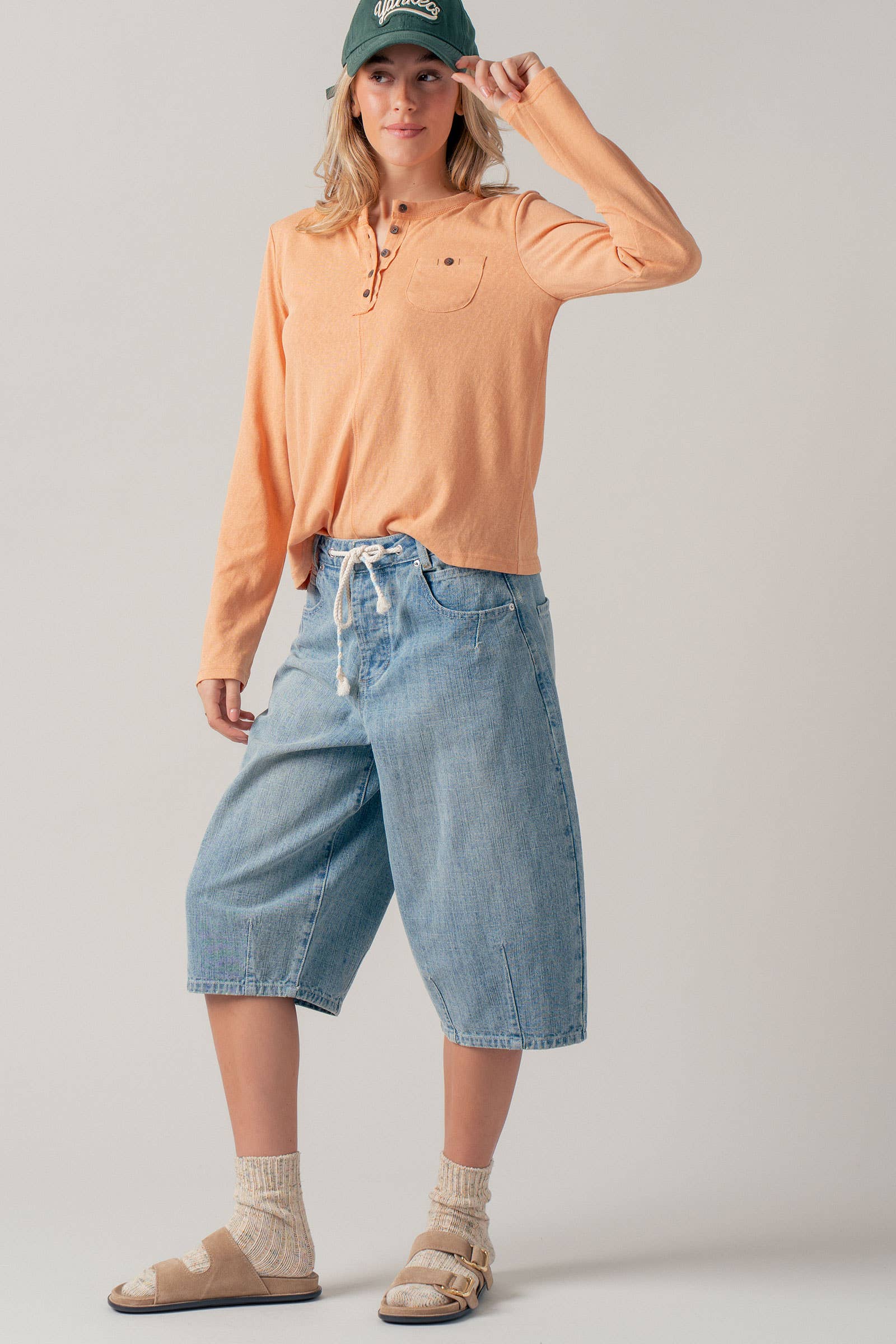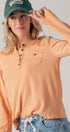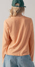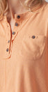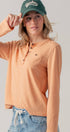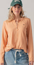 Perfect for laid-back days, this peach-colored long sleeve top combines comfort with casual style. Crafted from a soft cotton blend, the design features a classic henley neckline with a four-button placket and a charming chest pocket adorned with a matching button detail. Exposed center seams running down the front and back add a unique, structured touch to the relaxed silhouette.